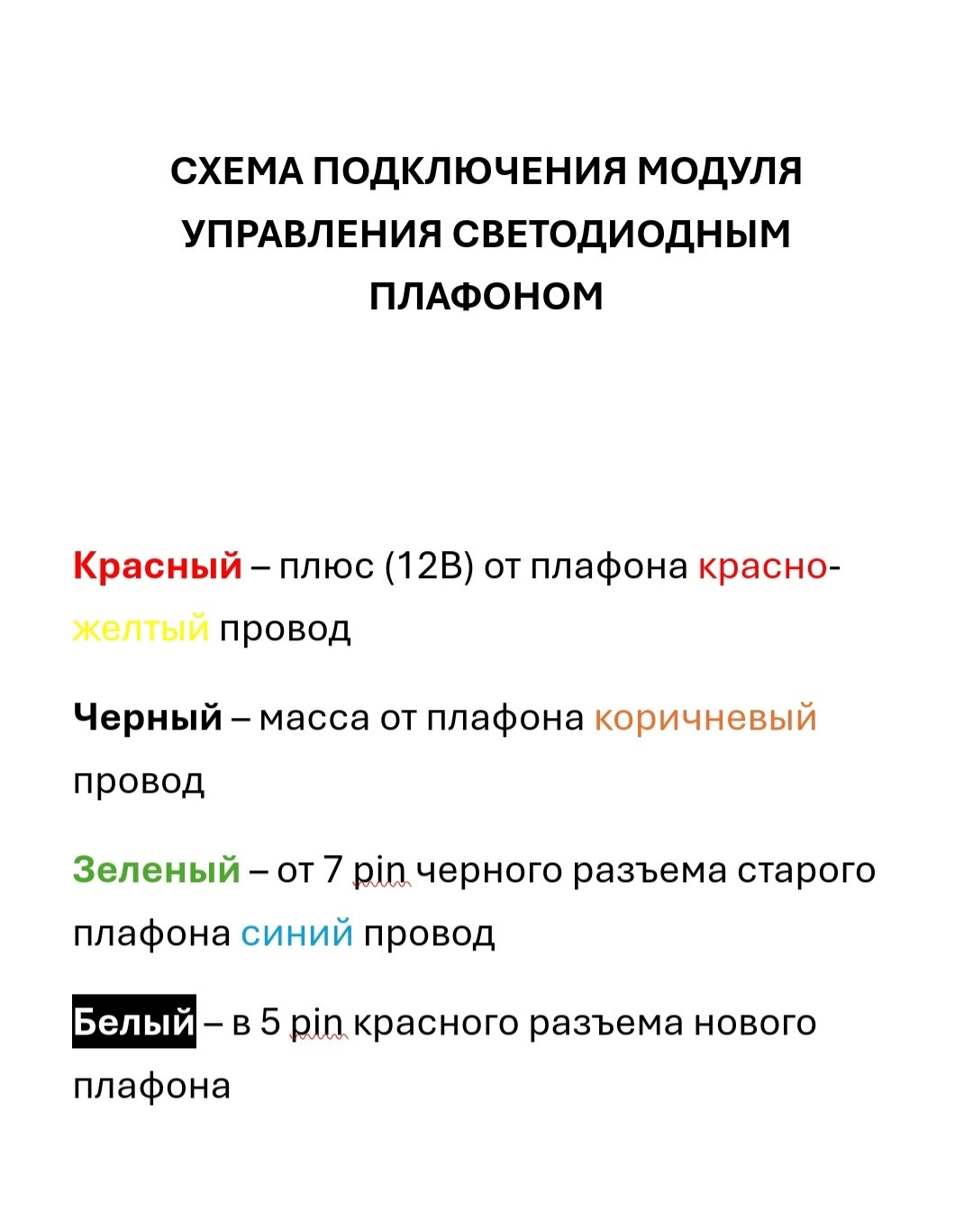Для подключения светодиодного плафона необходимо перепиновать наш черный разъем в новый красный согласно схеме.