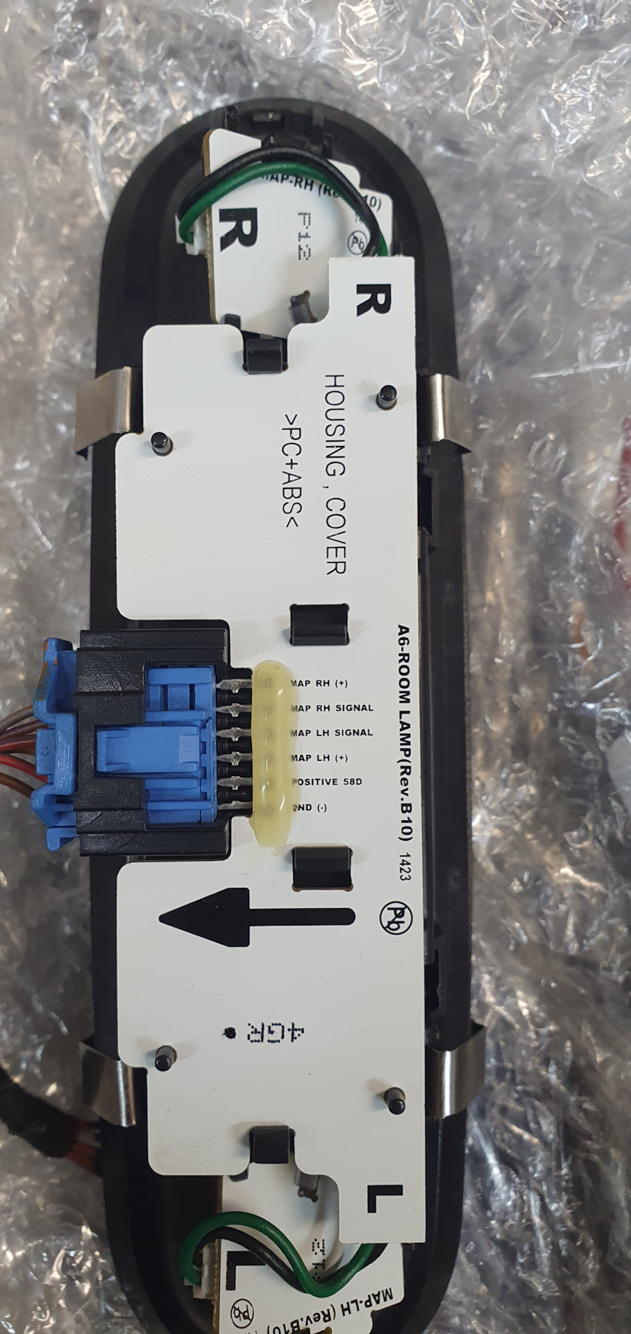 Датчики объема и хоумлинк от А6 встали как родные и по ним нет ошибок, т.е. их линшины и сигналы индентичны, а с плафоном фокус не прошел. Кодирование есть, но как оказалось в нашем блоке нет парамметрии, чтоб управлять этим плафоном. Очень печально, т.к. ламповый управляется сигналом от 09 блока, а светодиодный от 46 блока. И вот дальше начались проработки, чтоб сделать адаптер, типа линадаптера для рулей, который будет конвектировать сигнал от 09 блока в сигнал, понятный плафону.