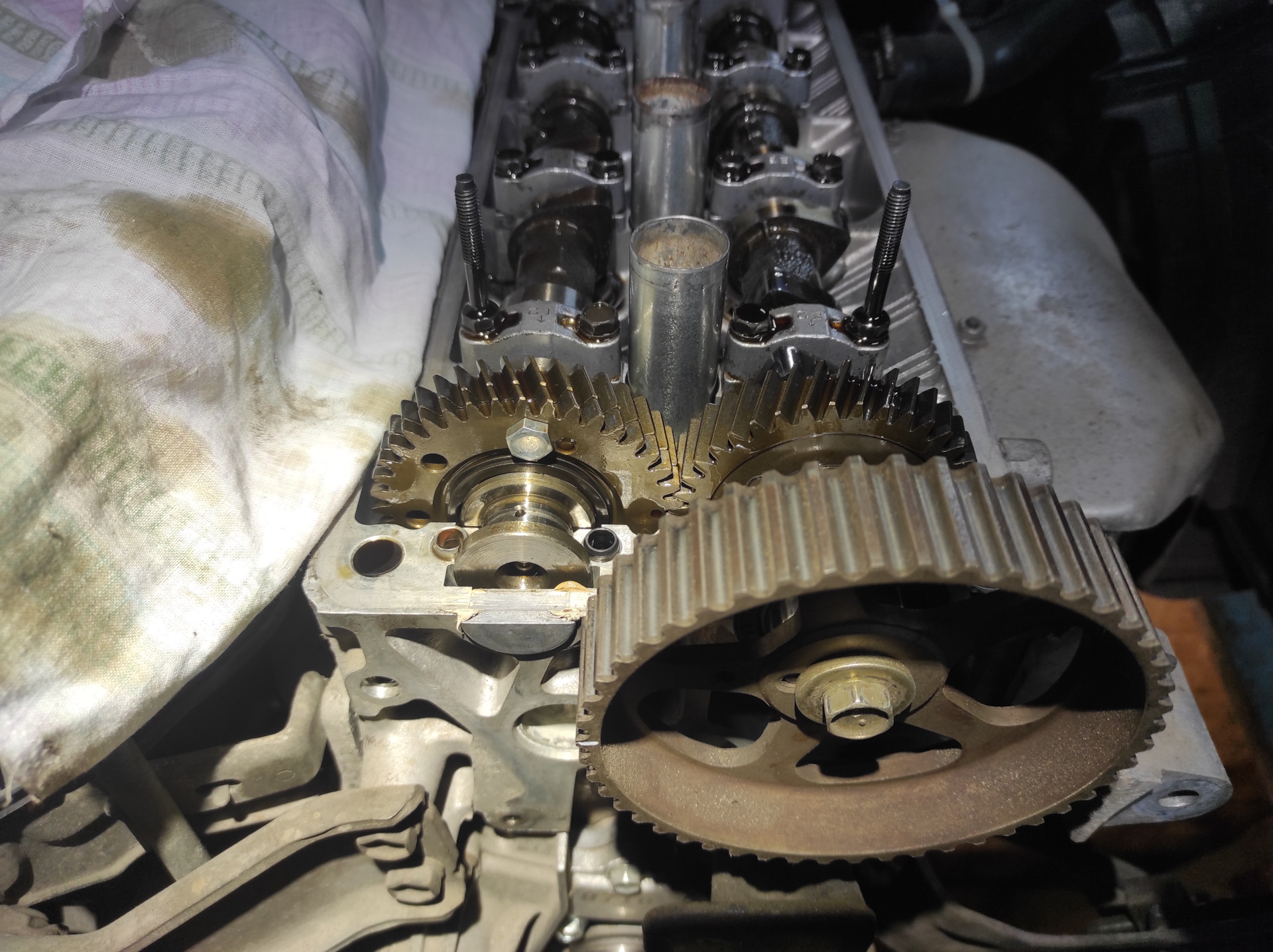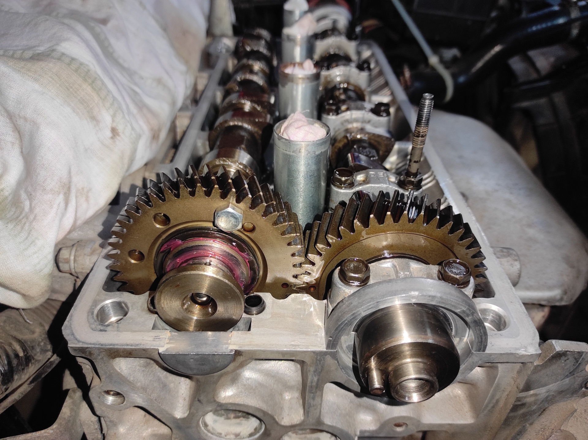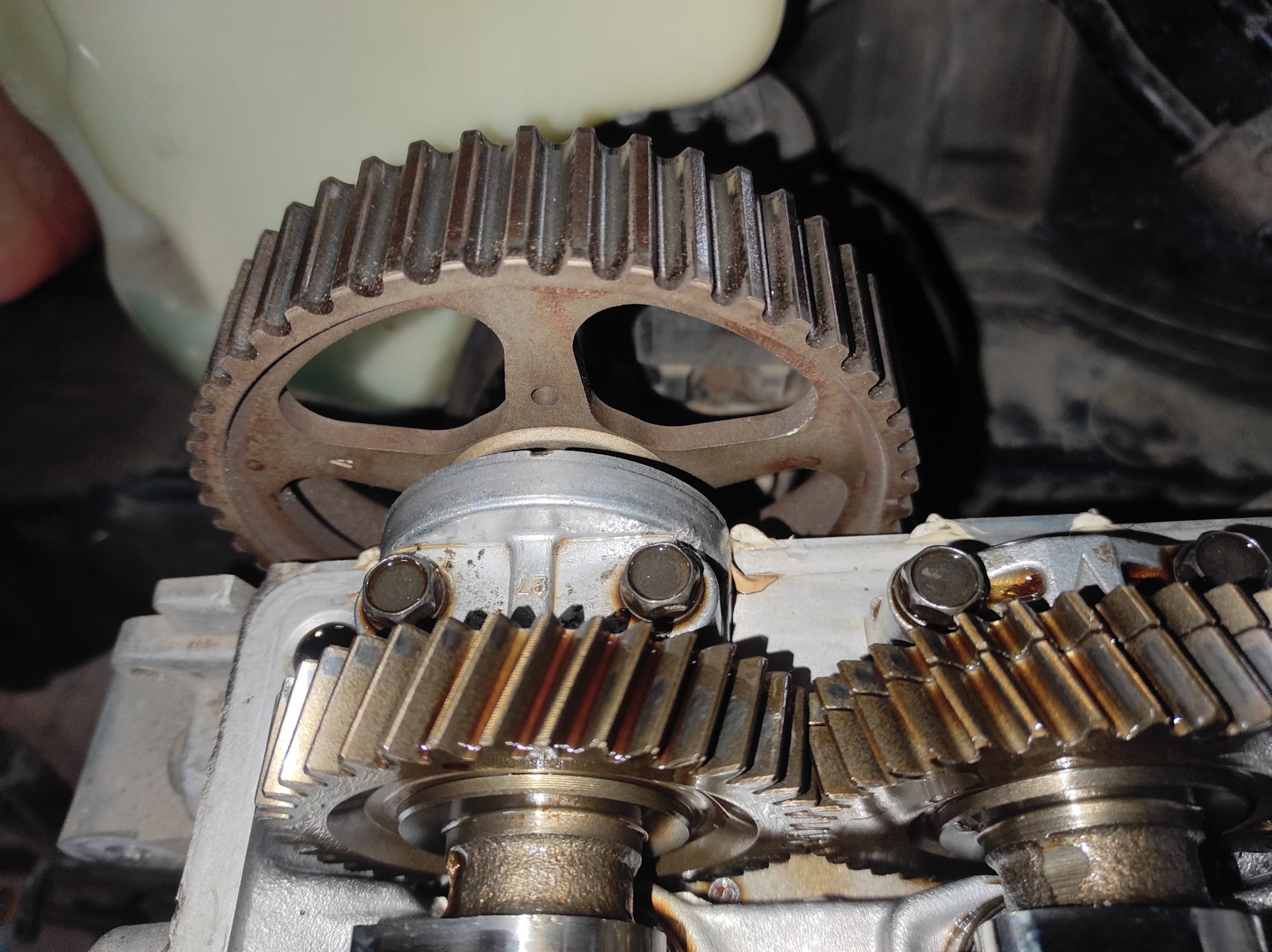 Вывернул фиксирующий болт шестерни впускного вала и поставил на место шестерню привода выпускного.