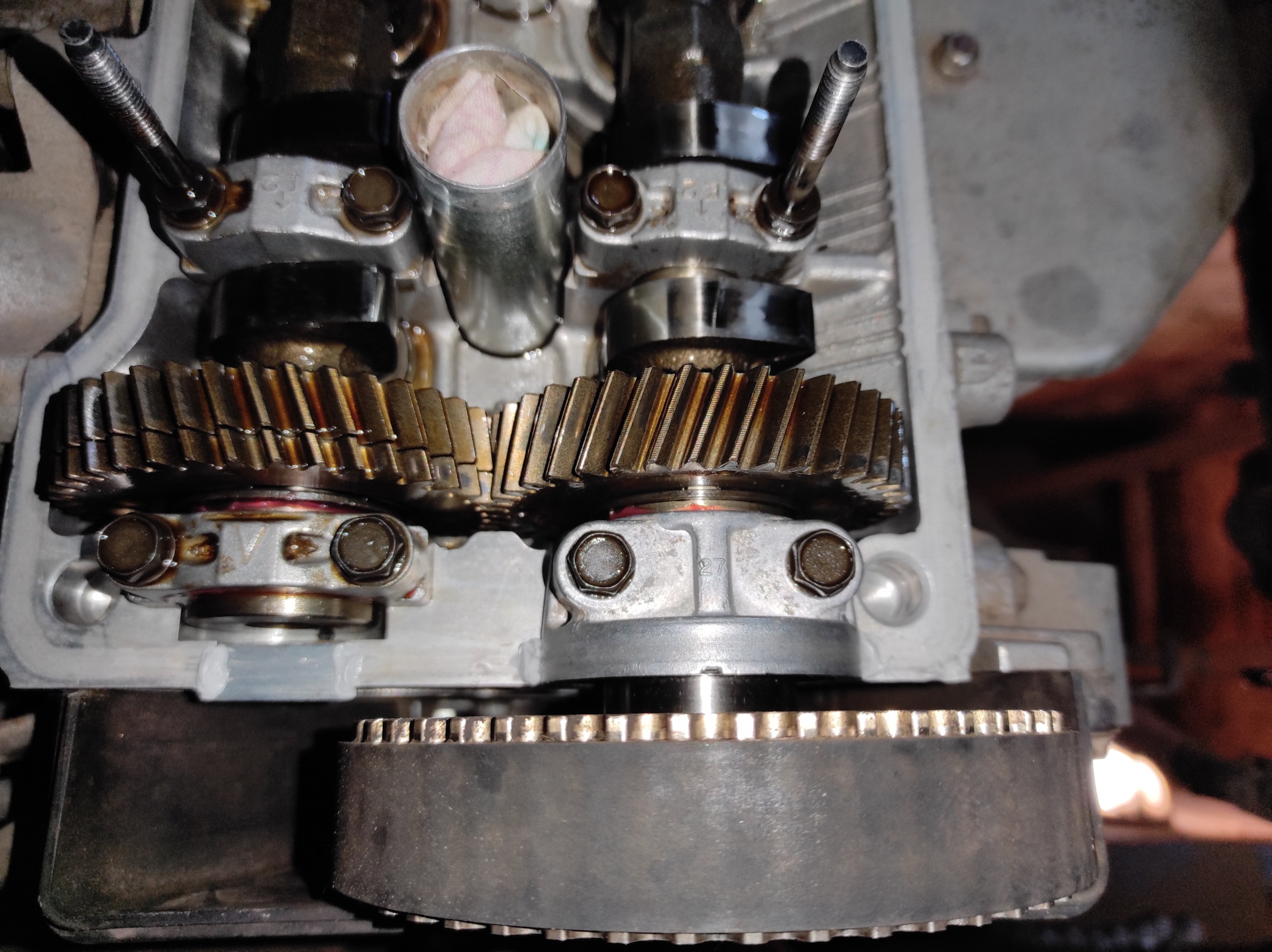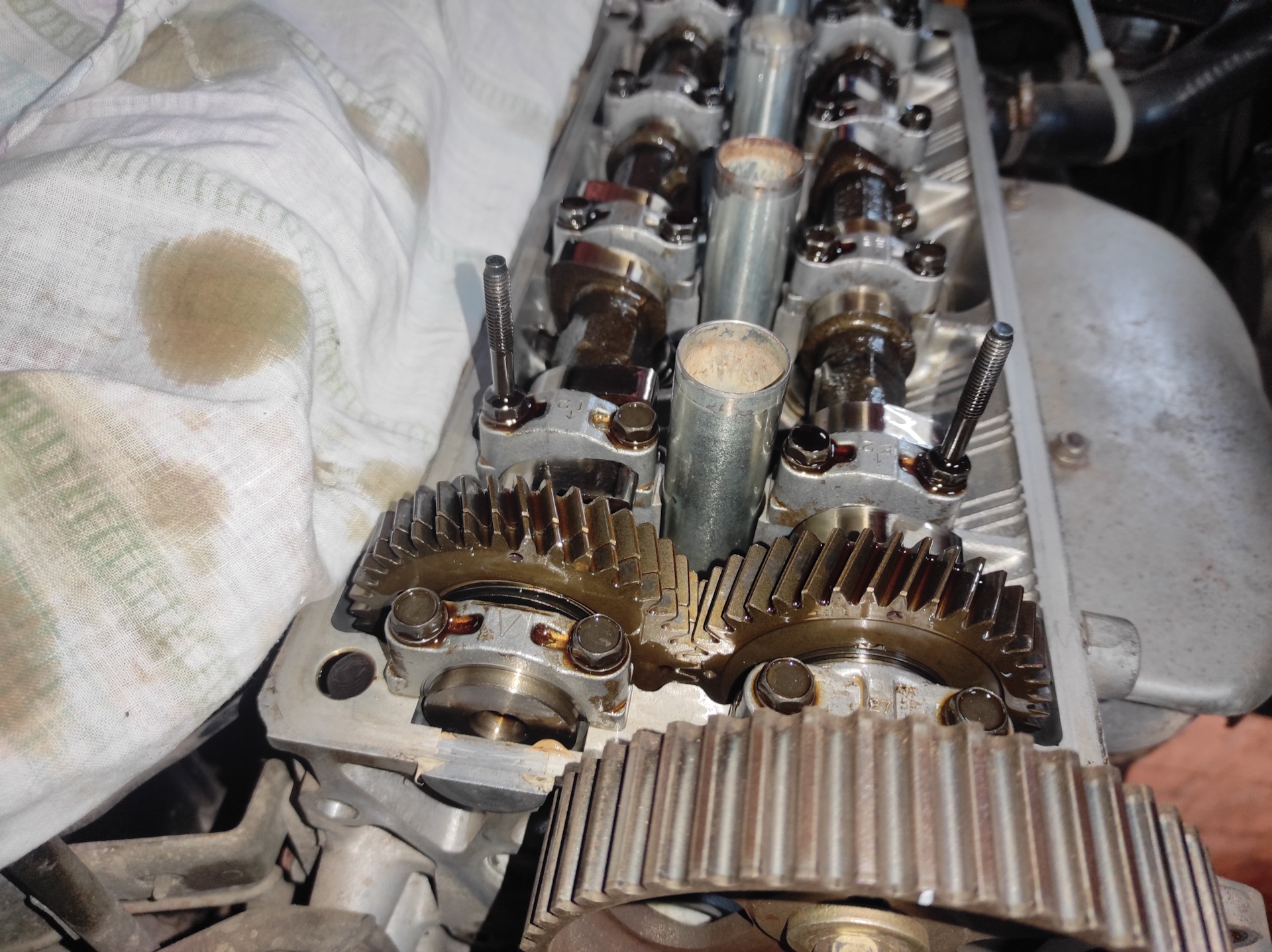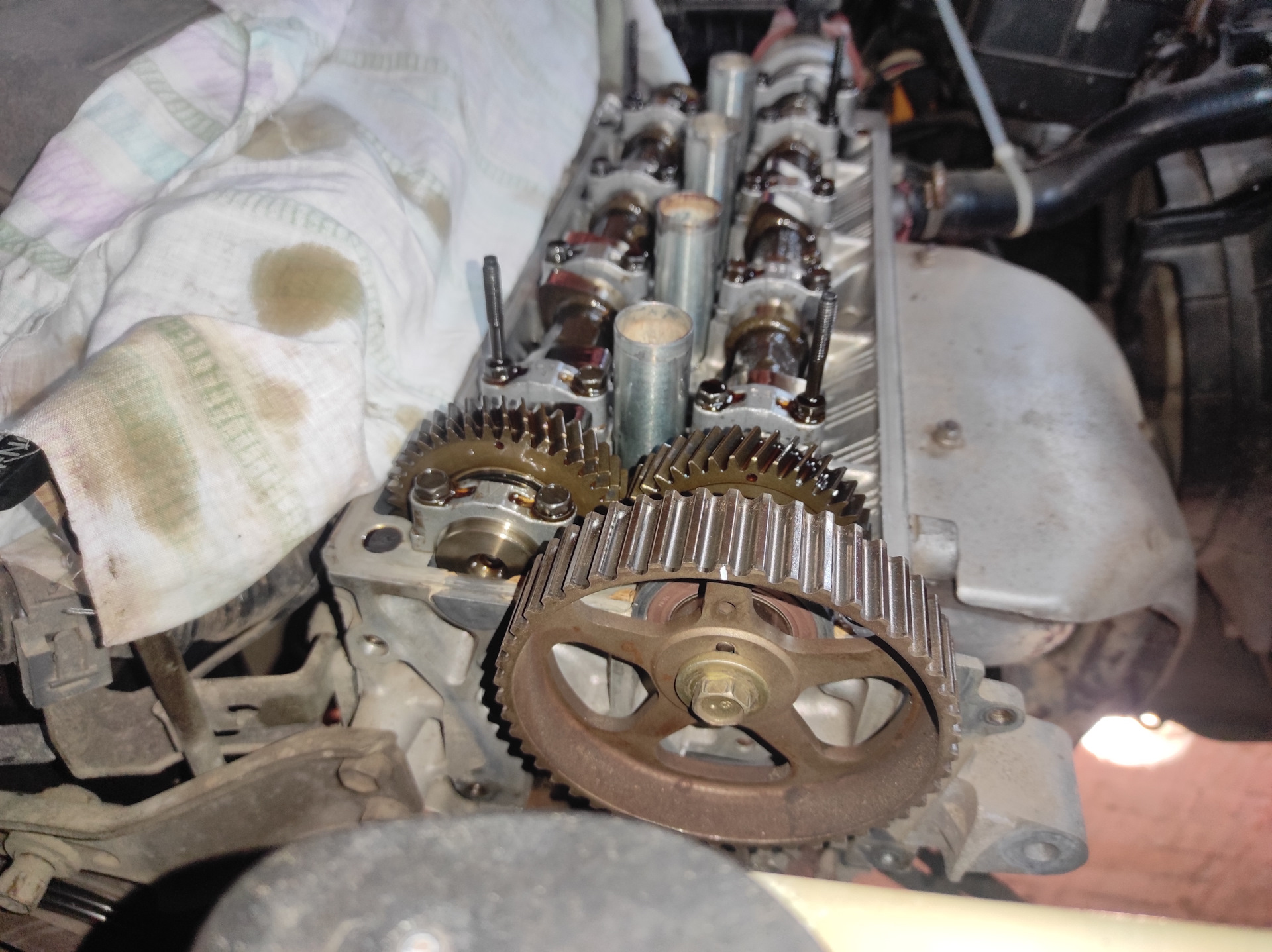 Вывернул фиксирующий болт шестерни впускного вала и поставил на место шестерню привода выпускного.