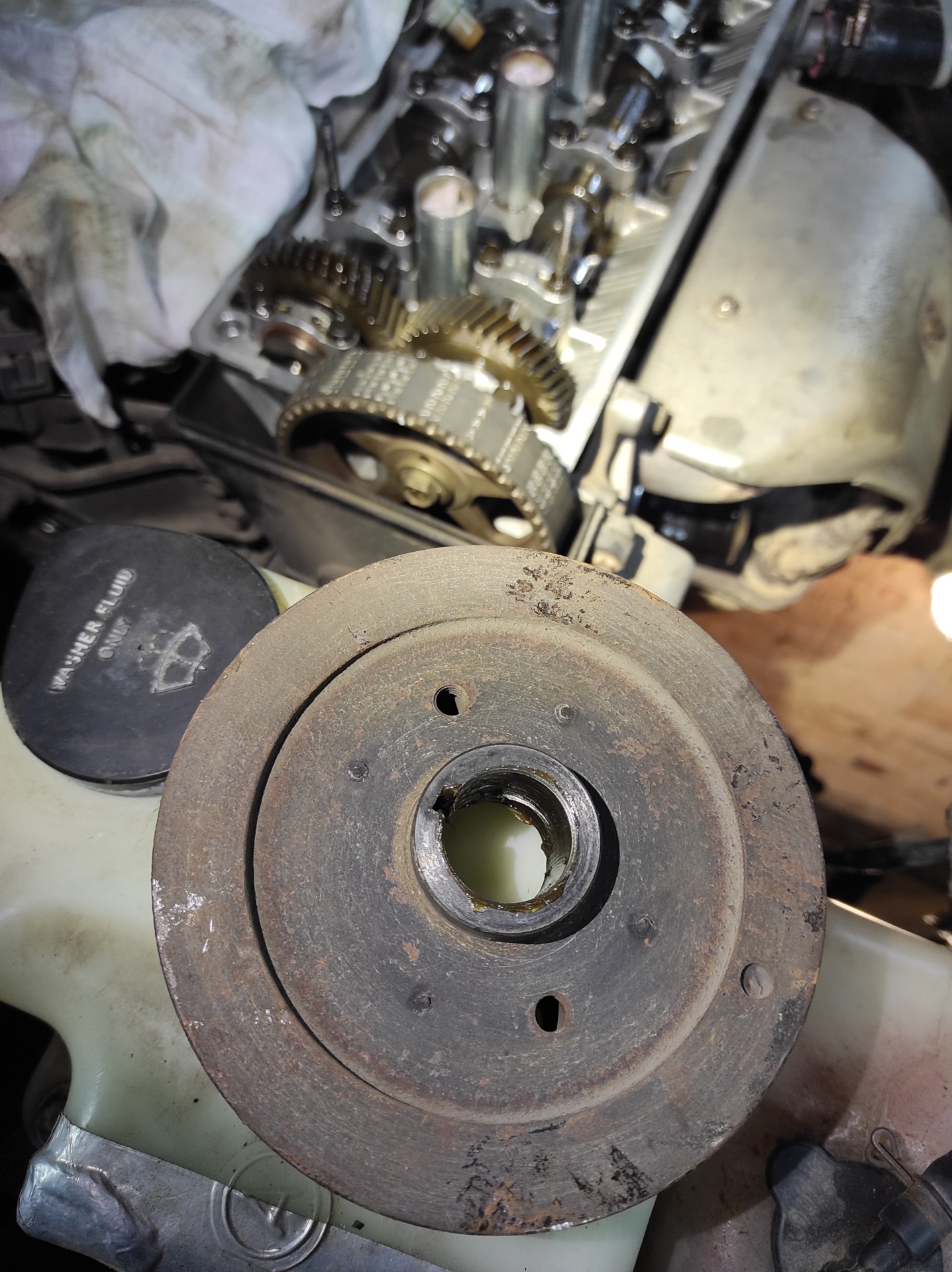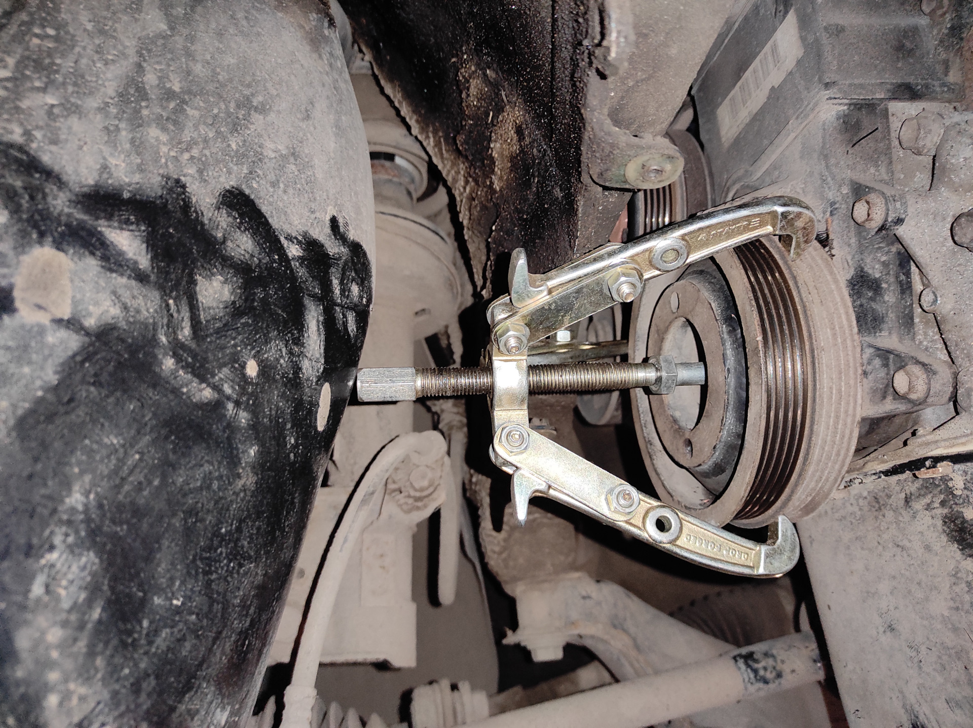 Скинул генератор, ремни. Надо снимать шкив коленвала и тут я упёрся, раньше легко отвёрткой сталкивался, а тут присох, блин. Пришлось съёмником тянуть, благо получилось зацепиться.