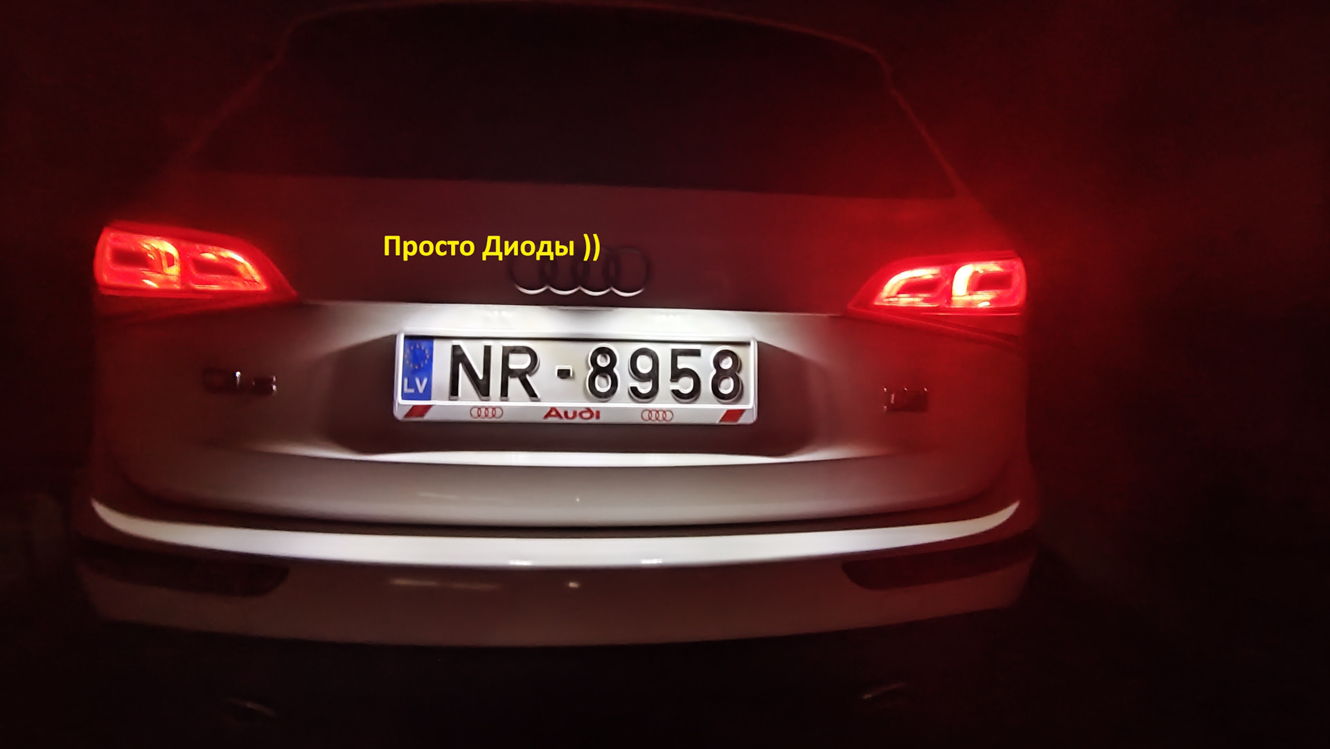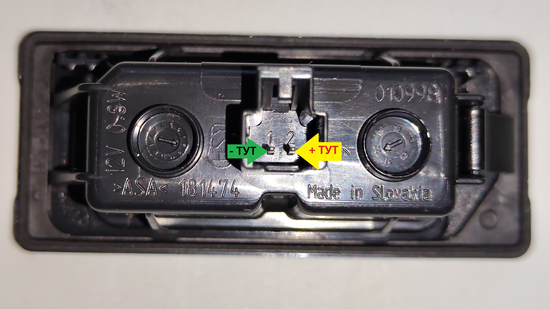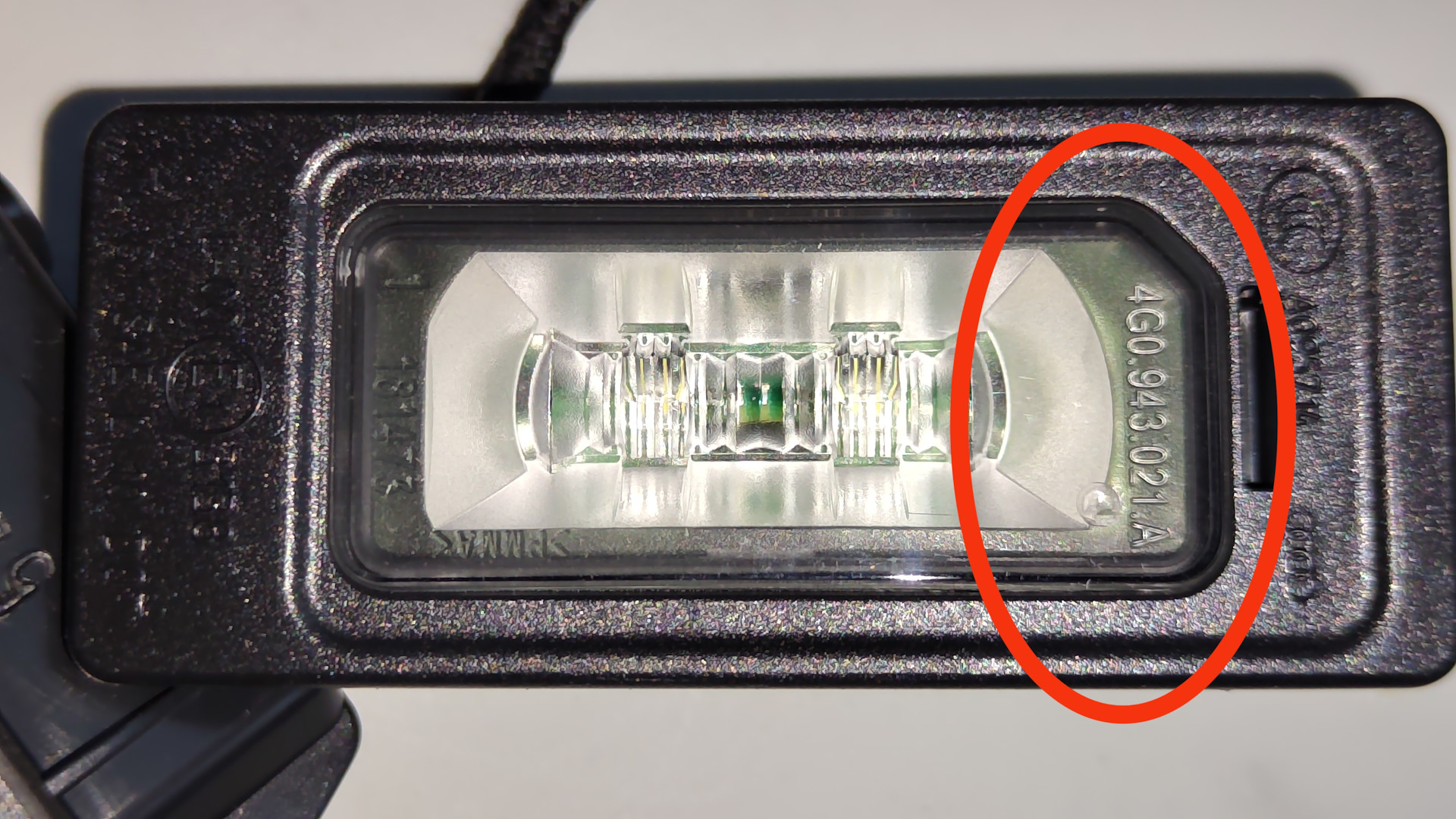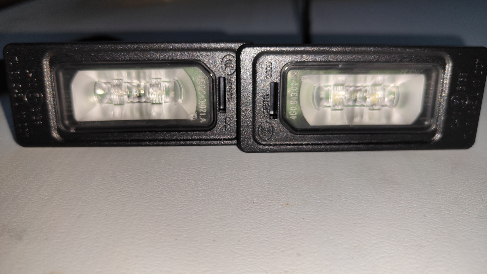 В общем сменил подсветку номерного знака с Oem Nr. 8T0 943 021 ламповая, на диодную Oem Nr. 4G0 943 021 А по факту ничего особо сложного нету, но надо проводки с переходниками, т.к на лампочках штекер идёт широкий а на диодах совсем маленький, провода заказал со всем известного сайта, но не досмотрел что второй штекер не подходит на подсветку номера, ( по моему на освещение которое установлено в дверных картах ) не беда, пришлось тот штекер распиновать и подключить без штекера, то есть провода просто вставляешь в штекера которые выходят из машины и всё огонь работает )), ну и перед заменой решил посмотреть при помощи мульти метра на машине какой провод +, а какой — , жёлтый +, а коричневый — , потому что на диодной подсветке внутри есть цыпарки, 1 означает минус, 2 означает + , значит что если меняешь полюса то не горят диоды, проверил перед установкой на аккуме отдельно, 2 к плюсу а 1 к минусу, горят, а если наоборот не горели, по освещению честно не понял разницы )) ну или на белой машине не так заметно как на тёмных, а возможно что по сравнению с китайскими, где полный фонарик в диодах, и три диода в оригинальных, по этому и не сильно освещают, как то так ))