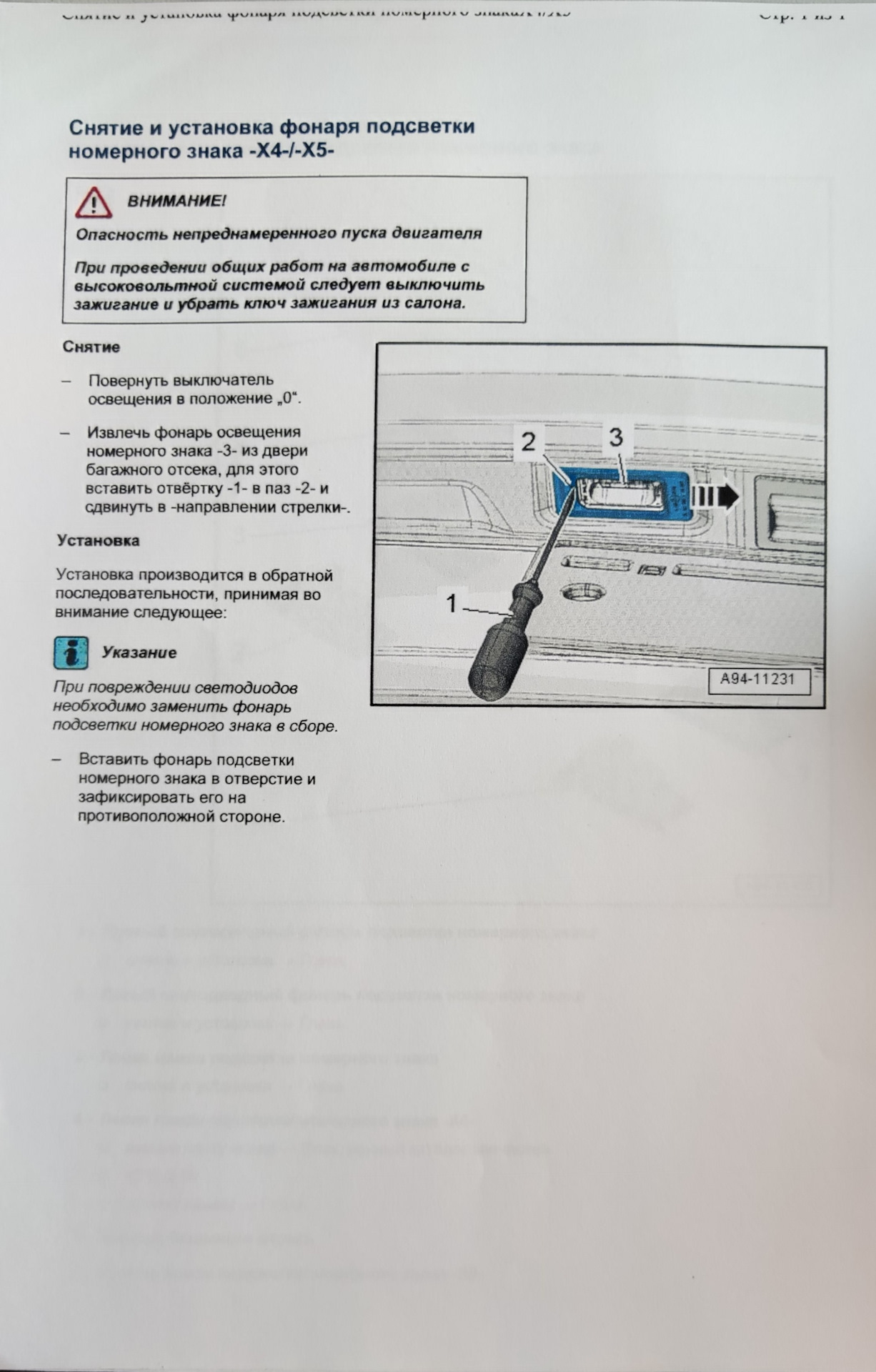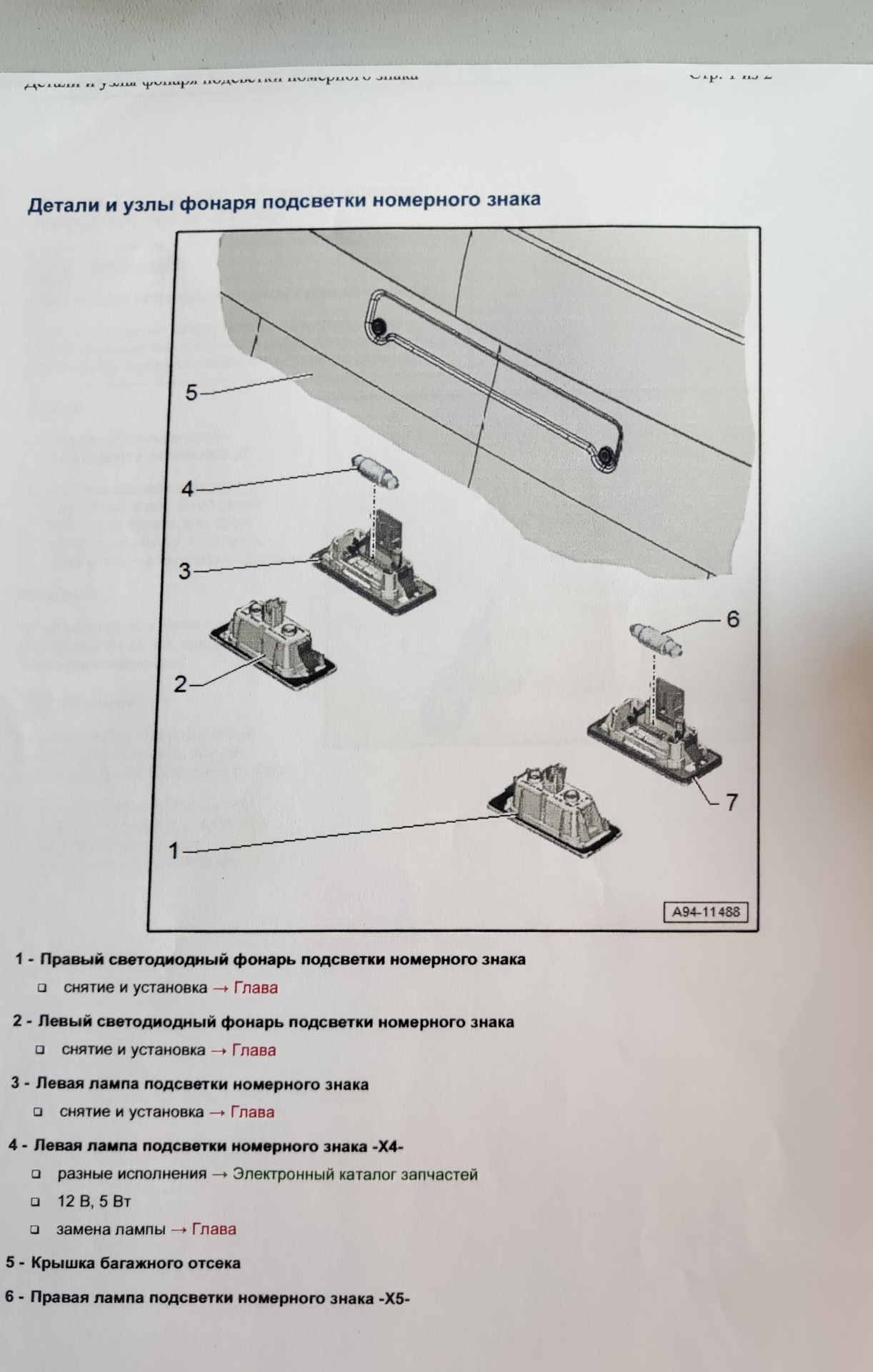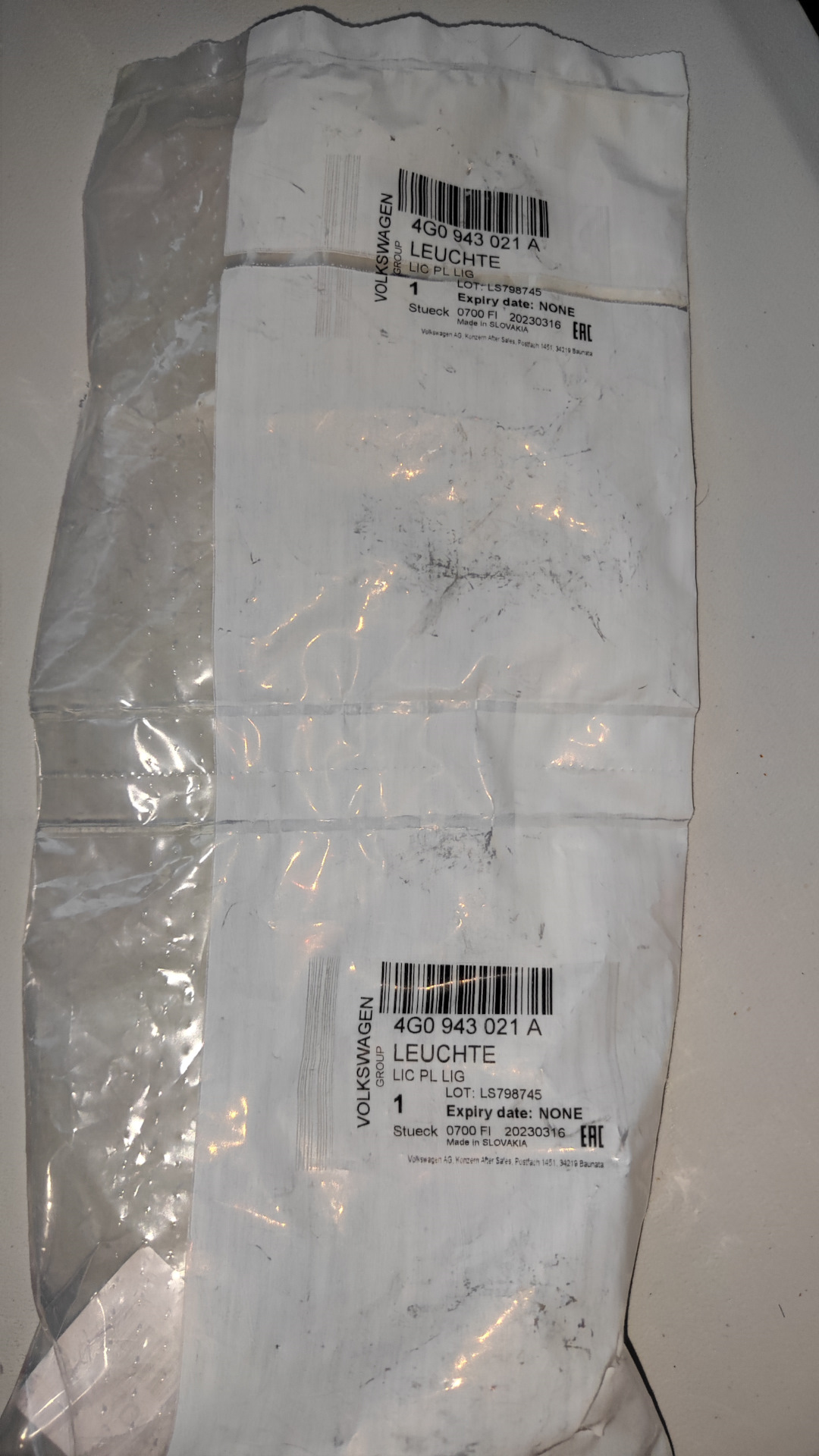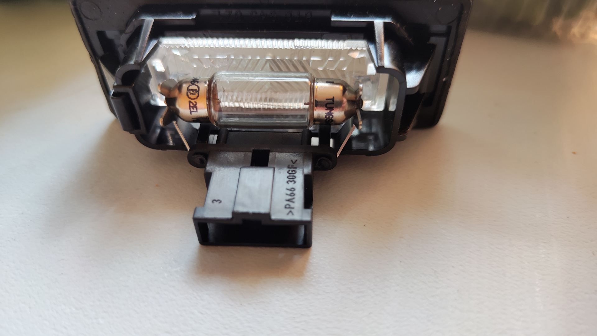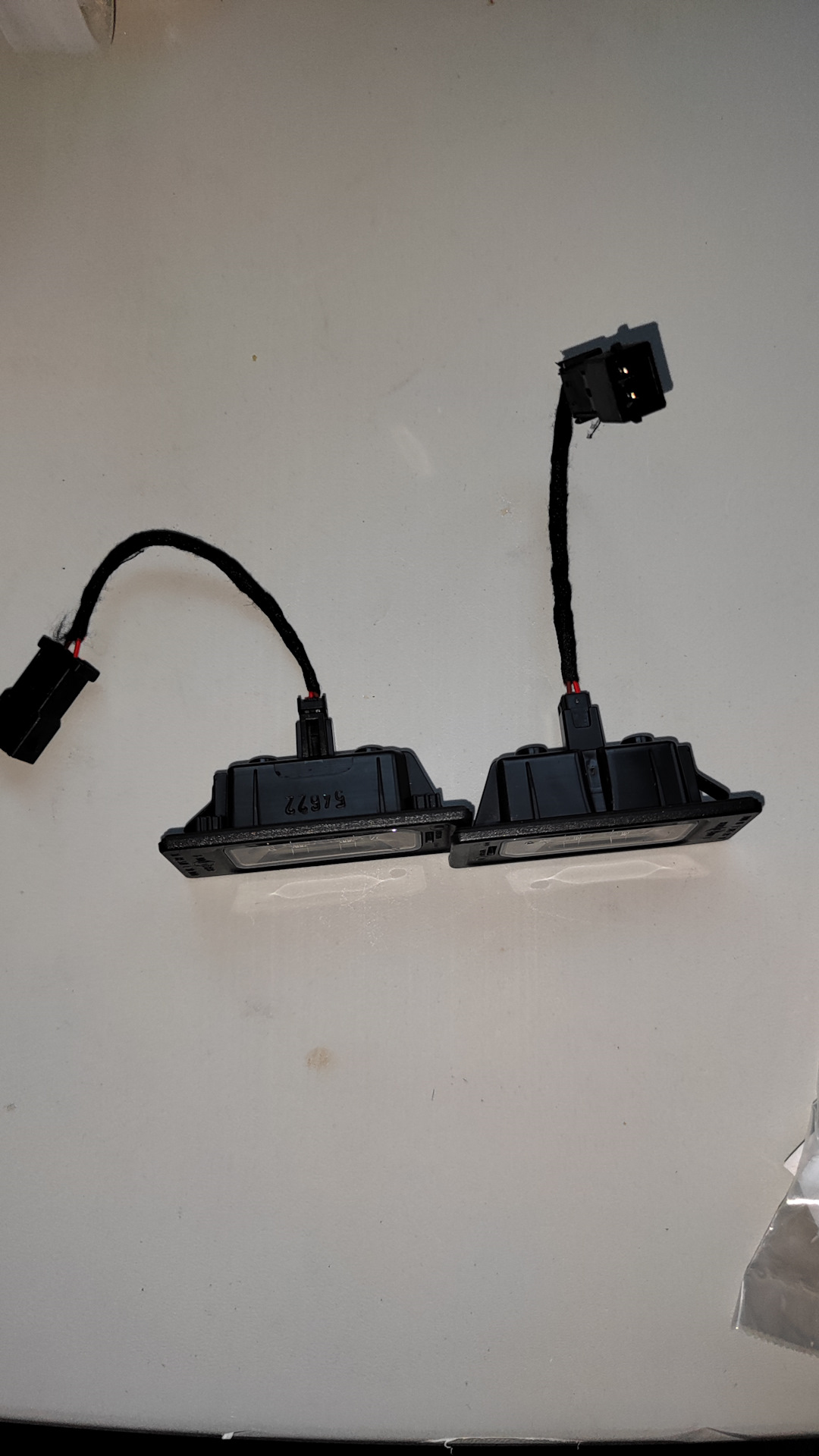 В общем сменил подсветку номерного знака с Oem Nr. 8T0 943 021 ламповая, на диодную Oem Nr. 4G0 943 021 А по факту ничего особо сложного нету, но надо проводки с переходниками, т.к на лампочках штекер идёт широкий а на диодах совсем маленький, провода заказал со всем известного сайта, но не досмотрел что второй штекер не подходит на подсветку номера, ( по моему на освещение которое установлено в дверных картах ) не беда, пришлось тот штекер распиновать и подключить без штекера, то есть провода просто вставляешь в штекера которые выходят из машины и всё огонь работает )), ну и перед заменой решил посмотреть при помощи мульти метра на машине какой провод +, а какой — , жёлтый +, а коричневый — , потому что на диодной подсветке внутри есть цыпарки, 1 означает минус, 2 означает + , значит что если меняешь полюса то не горят диоды, проверил перед установкой на аккуме отдельно, 2 к плюсу а 1 к минусу, горят, а если наоборот не горели, по освещению честно не понял разницы )) ну или на белой машине не так заметно как на тёмных, а возможно что по сравнению с китайскими, где полный фонарик в диодах, и три диода в оригинальных, по этому и не сильно освещают, как то так ))