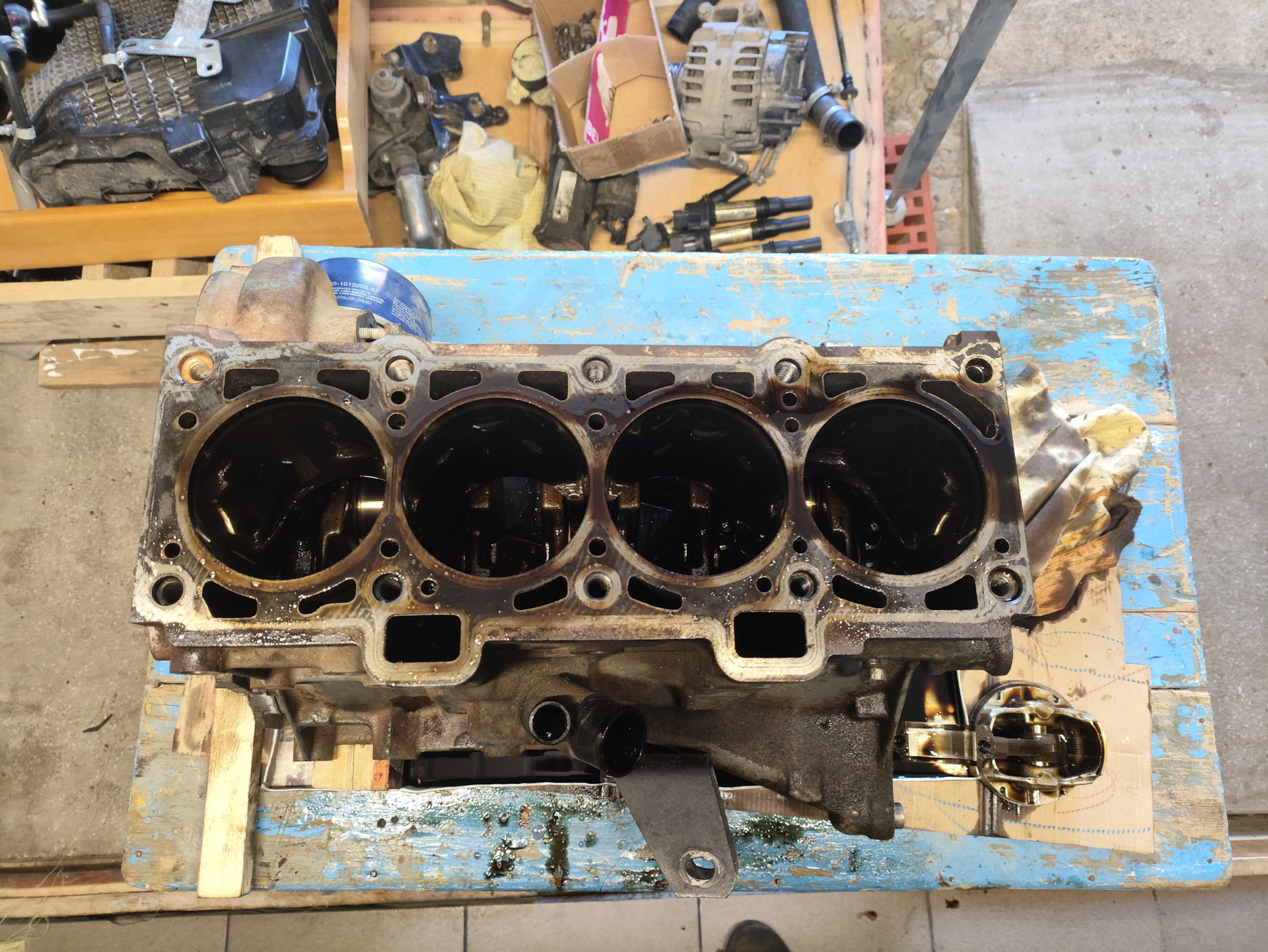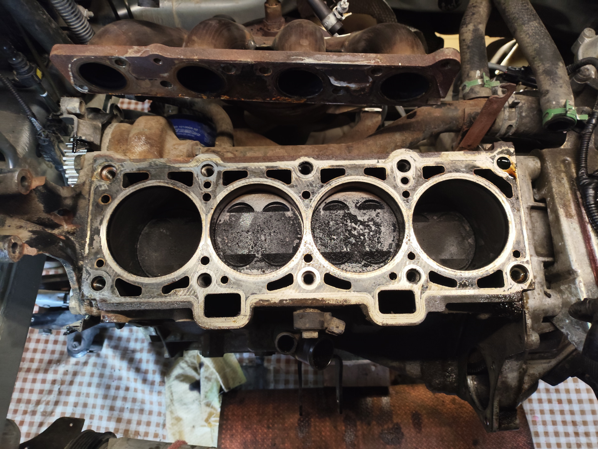 28.04 отмыл двигатель керхером, отключив аккумулятор. Стало чище под капотом, но не идеально. И начал разбирать. Решил снимать голову, мерить цилиндры. До этого делал эндоскопию и замерял компрессию. Эндоскоп показал нагар. И всё! Так что задирав я не боялся. Забегу вперёд, скажу, что и даже натёртостей или залысин на цилиндрах тоже нет. Компрессия была следующей: 1й- 13, 2-ц — 14, 3й-13,5, 4й- 13. В 2 и 3 цилиндре масла больше всего!