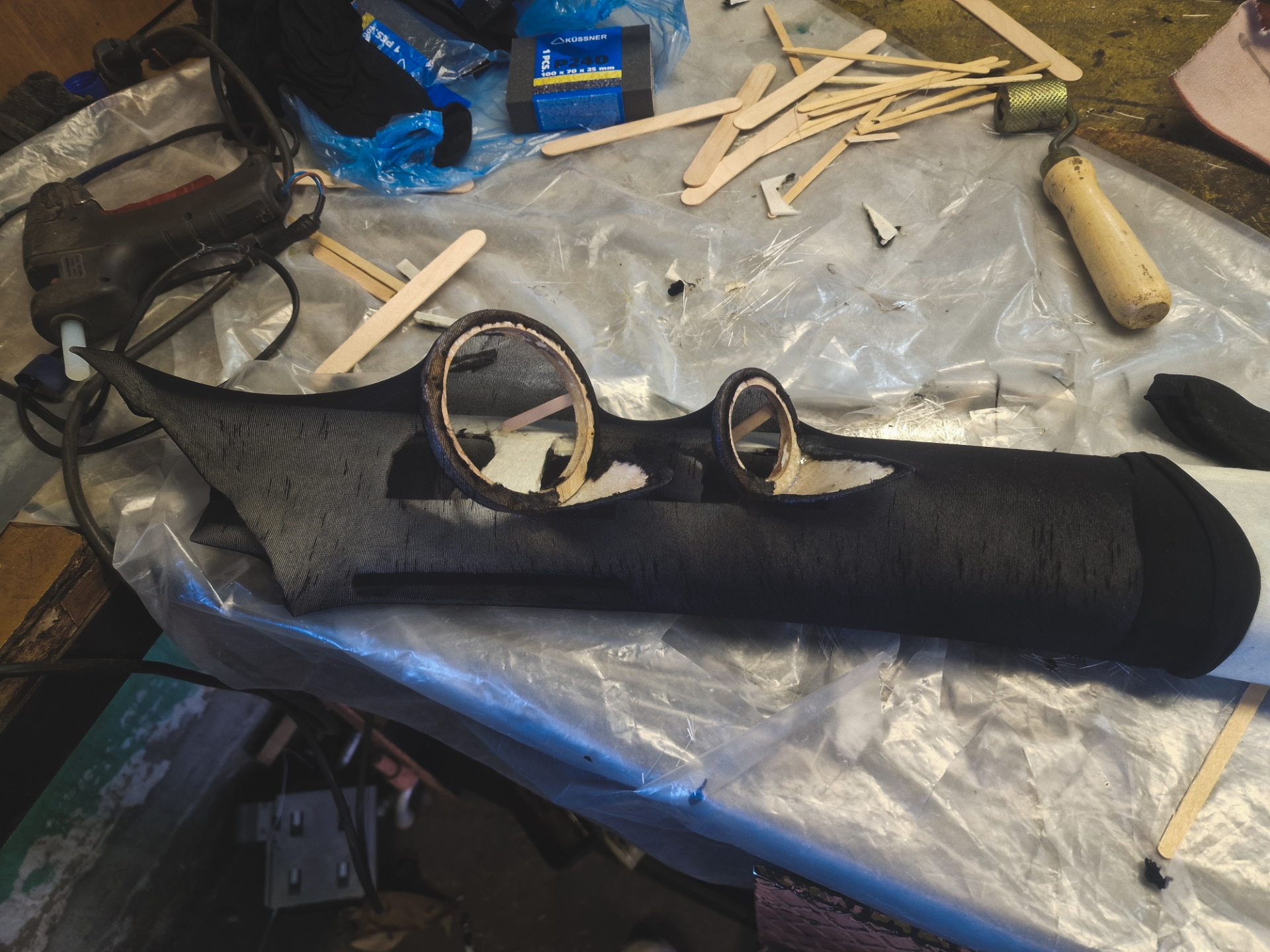 Если бы брал обычную ткань с подкладкой — можно было обойтись и без шпатли, натянуть на все это дело и забыть. Но нет, хватит легких путей, подумал я))
