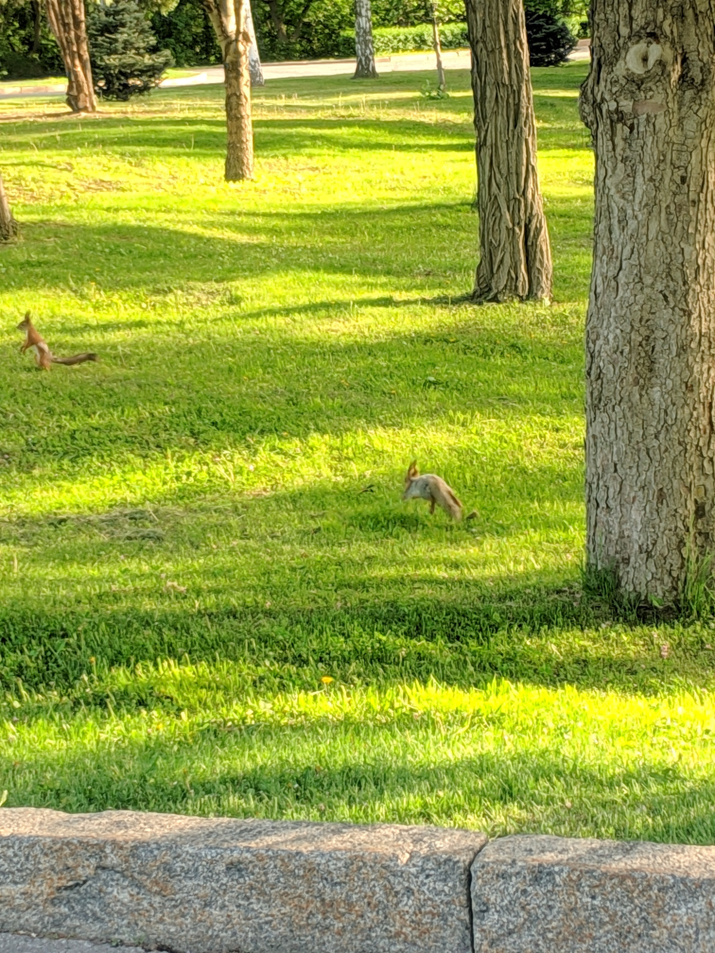 В парке куча белок. Тощие, еще не вылинявшие, но шустрые)))