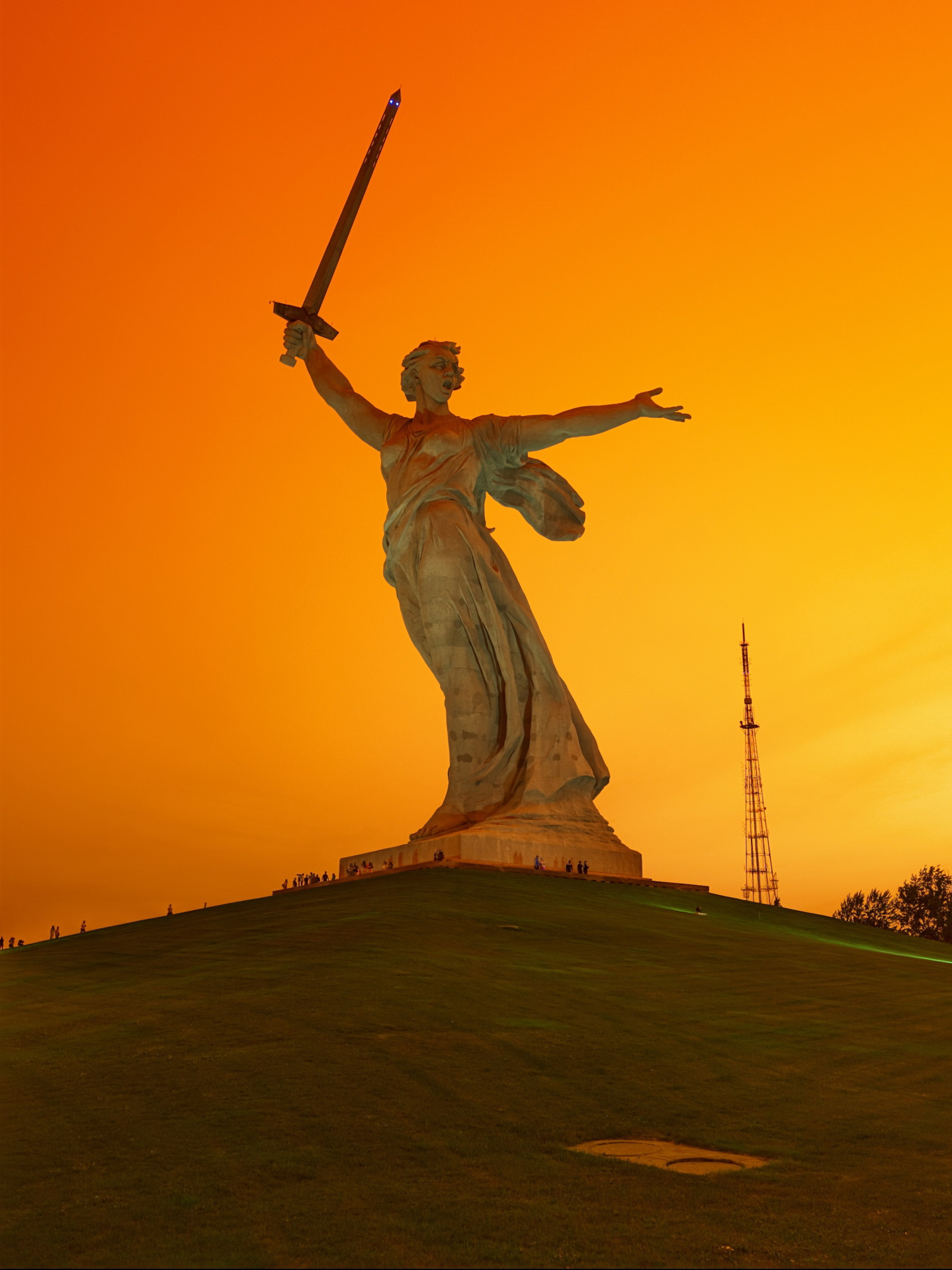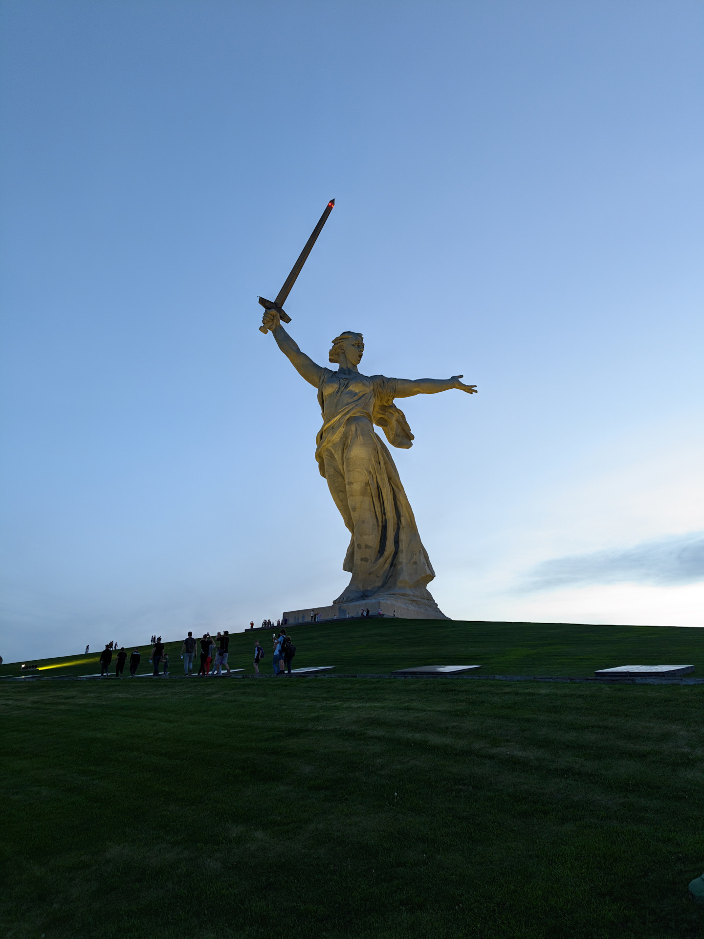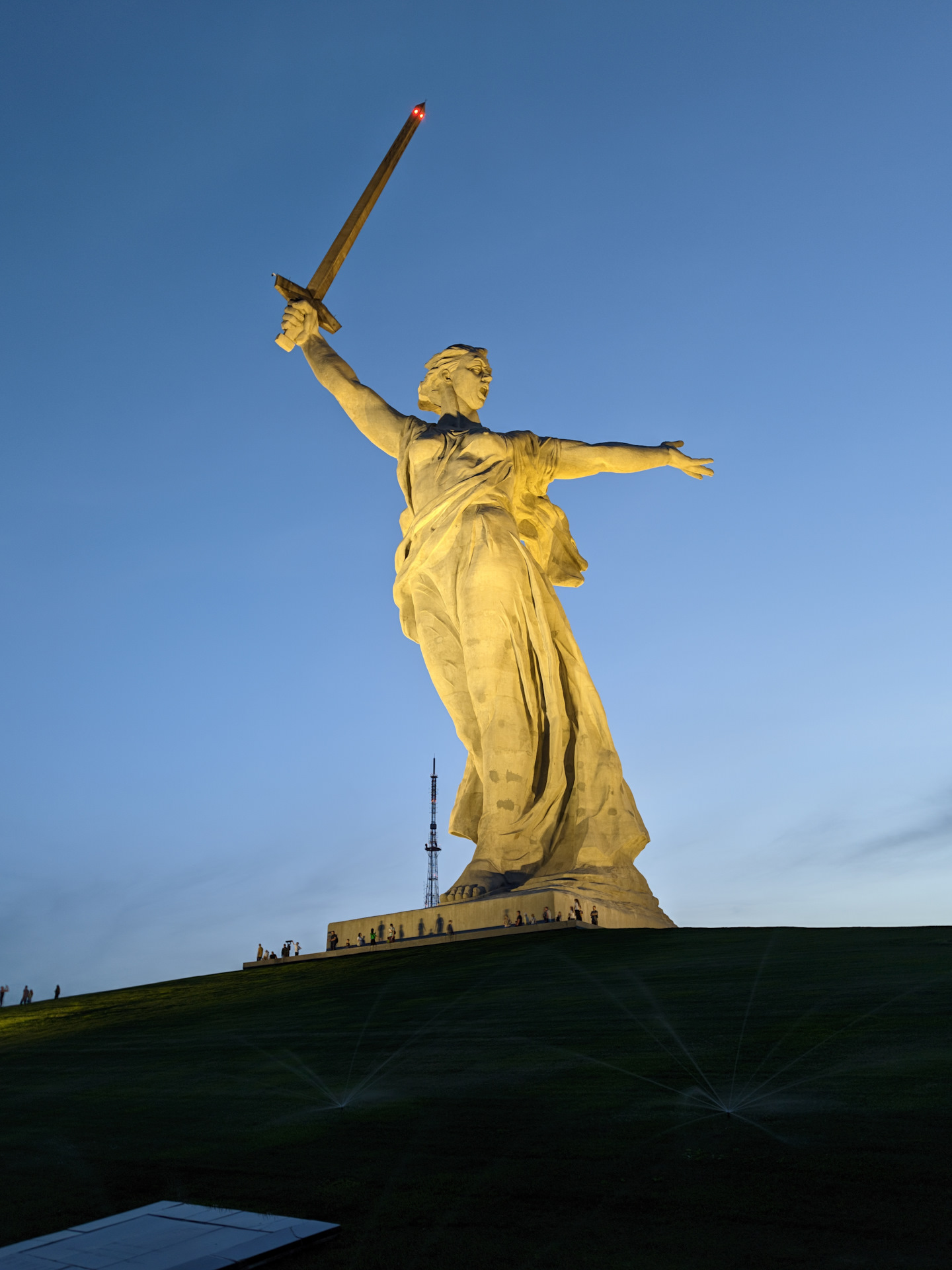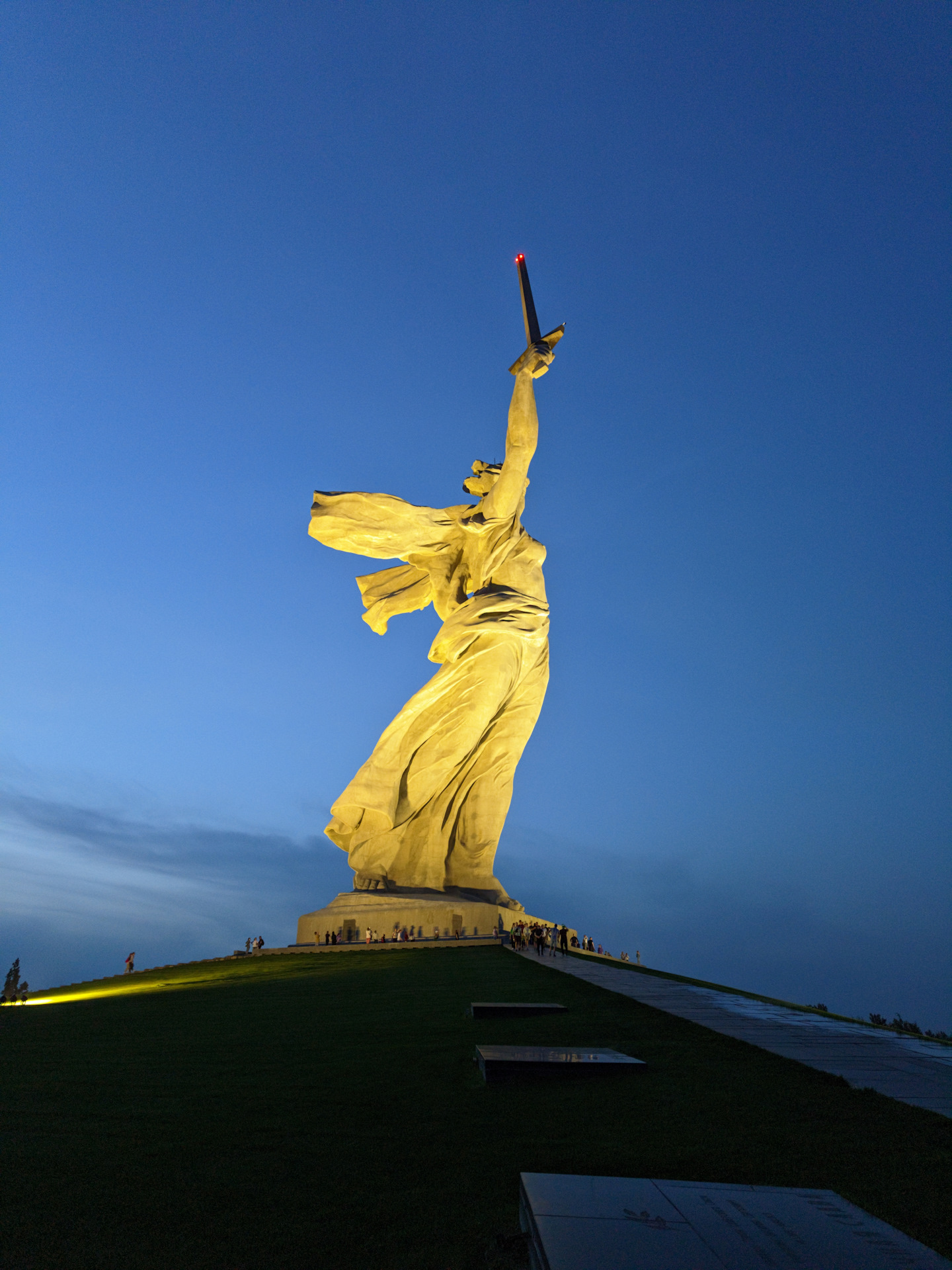 Лучше снизу идти от скоростного трамвая, больше впечатляет и ночью там тоже прикольно. Ночной Волгоград вообще отдельная история, с каждого бугра вид классный