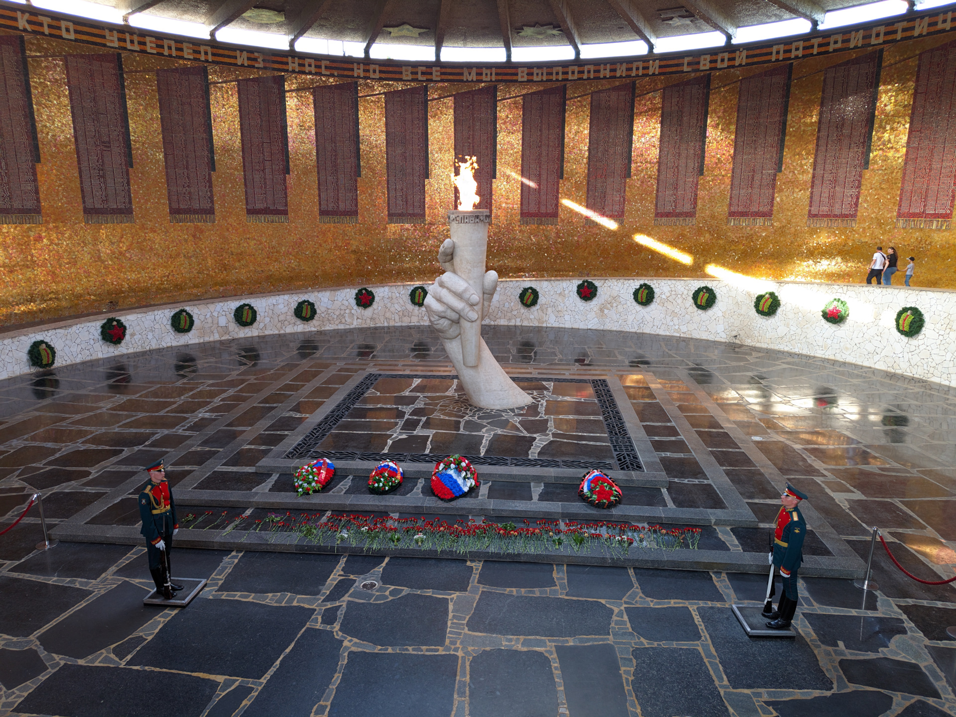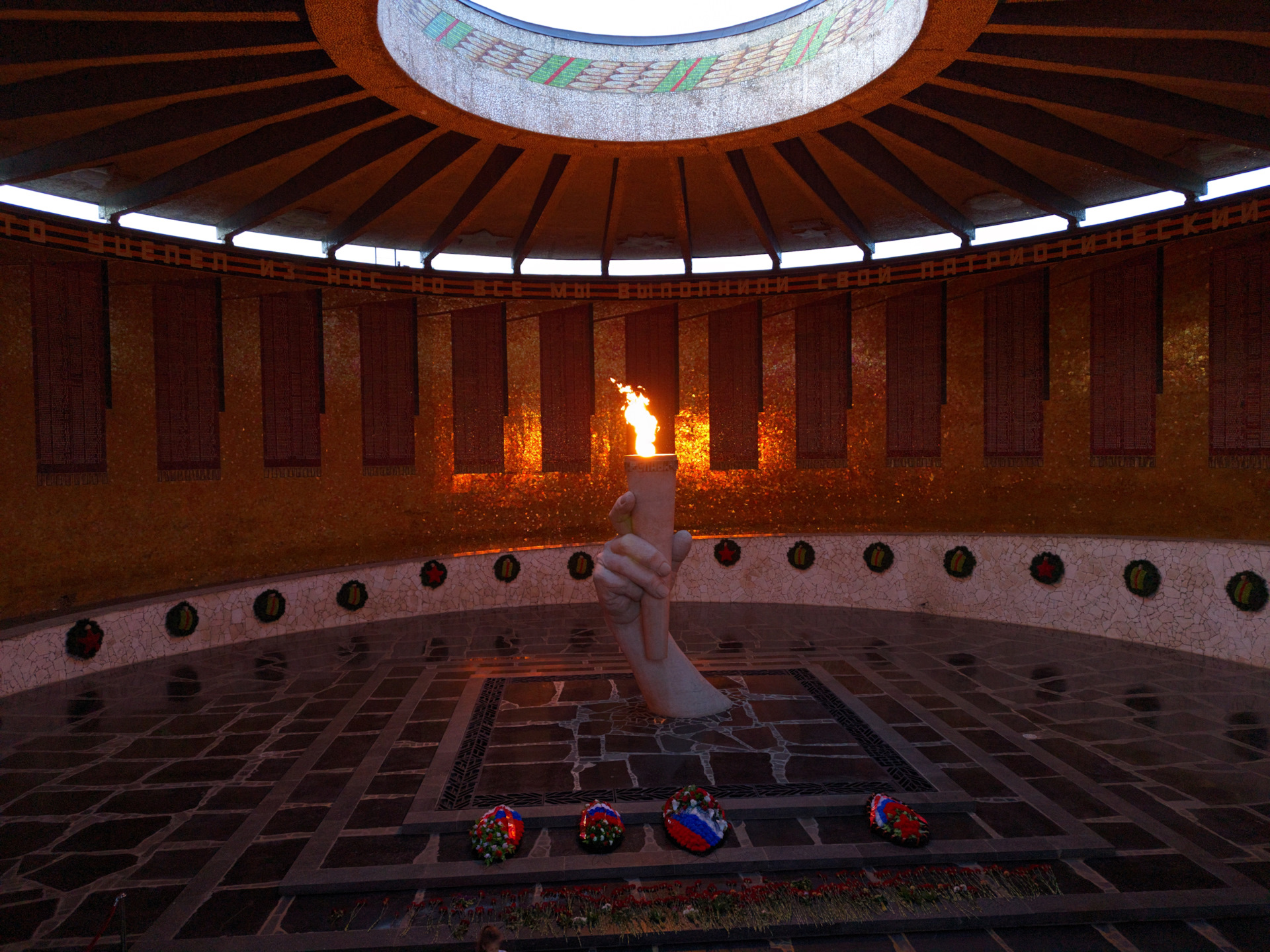 Замысел этого памятника очень сильный. При свете дня и в темное время суток он выглядит совсем по-разному. Причем, в темное время- просто непередаваемо. Когда отблеск от Вечного Огня отражается от стен… У меня нет зеркалки и проф. оборудования, да они и не передадут, скорее всего, но глазами это надо увидеть.