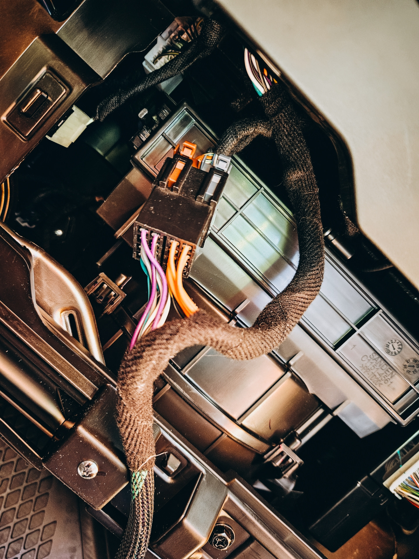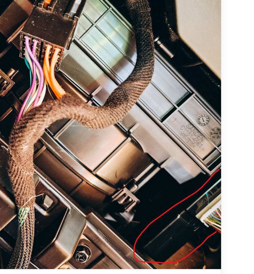 вот этот блок держится на 2 саморезах сверху и снизу. Отключил разъем и снял его. Образовалось окно между кузовом авто и вентилятором печки. Засунул туда dsp предварительно наклеил липучки 3M на dsp и ответную часть на этот блок. Вернул обратно блок и прижал к нему dsp вертикально. Липучки мощно прихватили + сверху стянул блок и dps длинным хомутом для надежности. Потом подключил кабель. В и бардачок закрылся без проблем