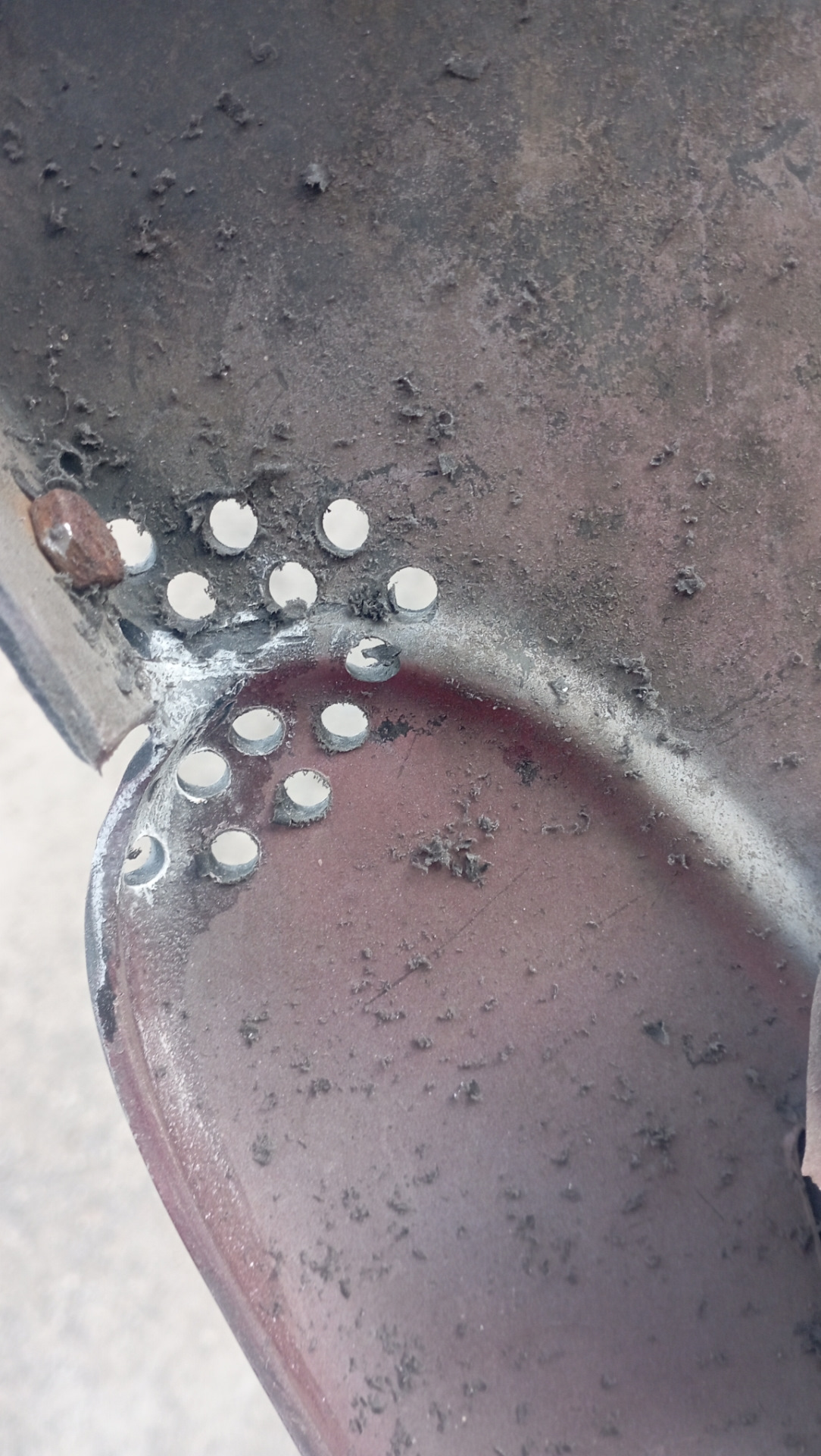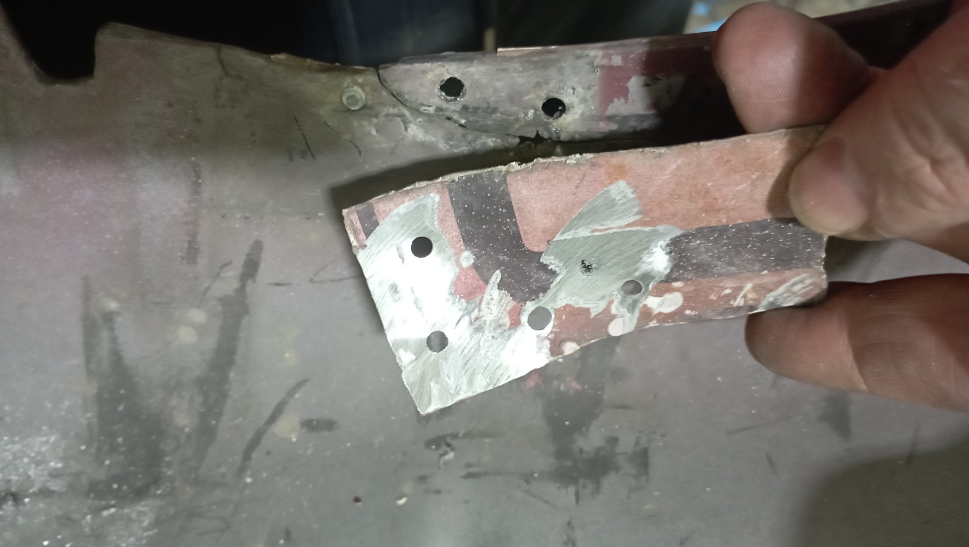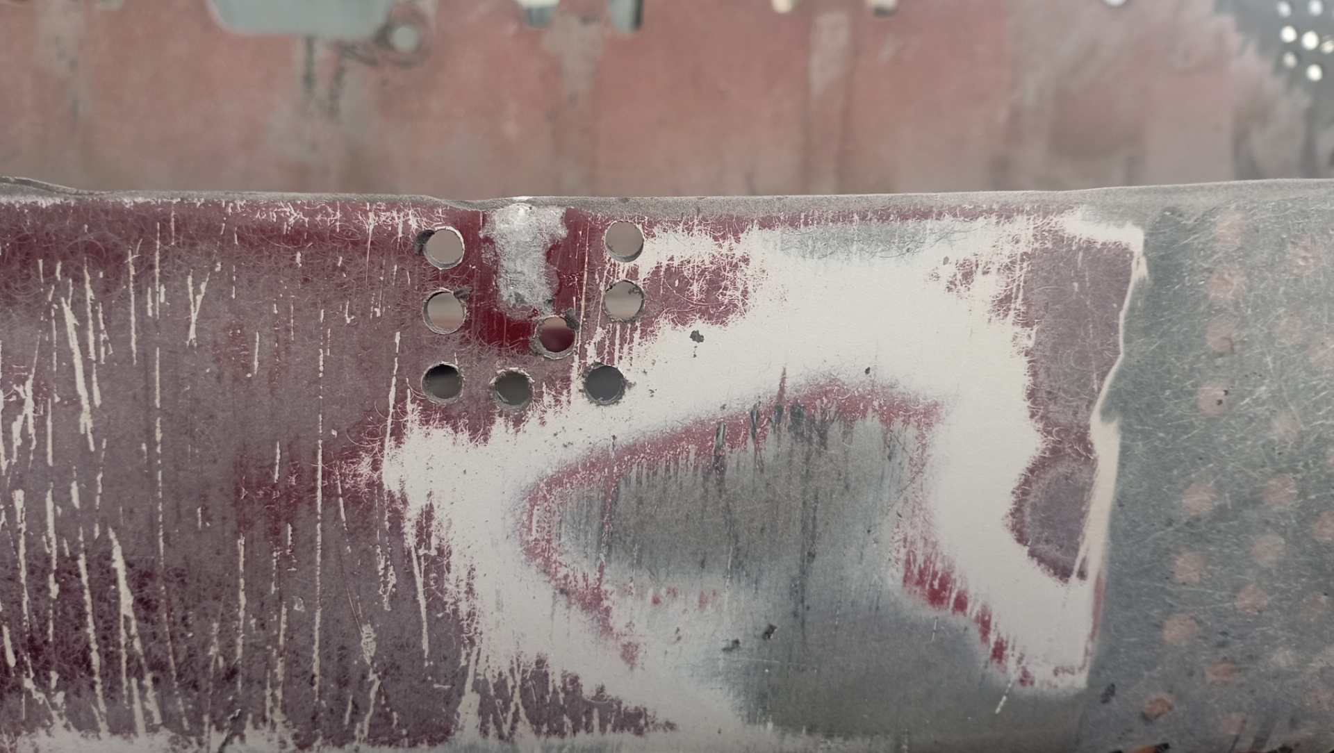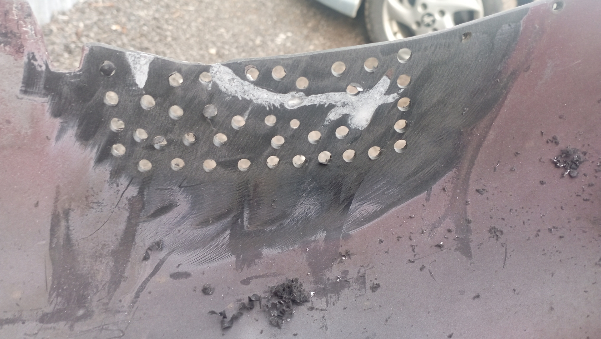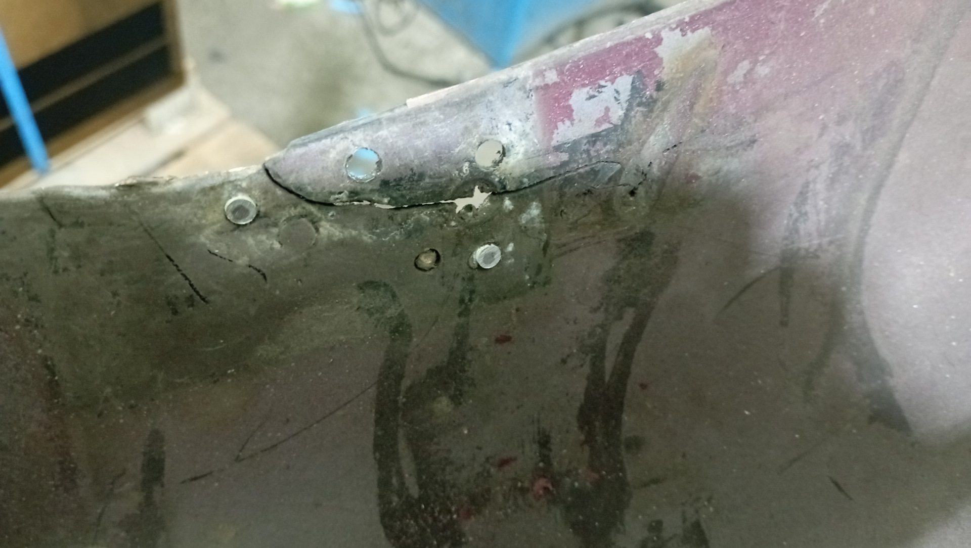 В местах ремонта, где использованы клёпки и металлические пластины, убираем гору шпатли и высверливаем клёпки.