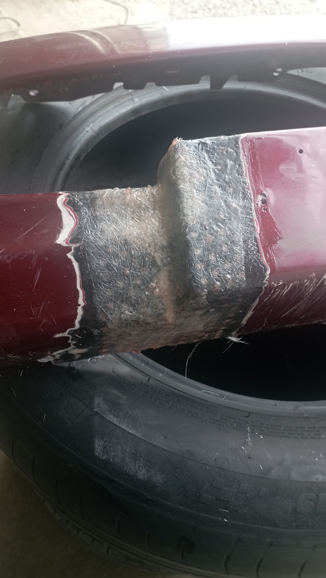 Что бы начать работать со смолой небходимо надёжно зафиксировать все трещины, иначе может быть нарушена геометрия и бампер получится кривой. Тут выручил клей Космофен, но чтобы обеспечить надёжное соединение необходимо после первоначальной склейки, прошарошить трещину дремелем с двух сторон и залить клеем с наполнителем. В качестве наполнителя я использовал соду. Весь процесс не фоткал, но думаю смысл понятен.