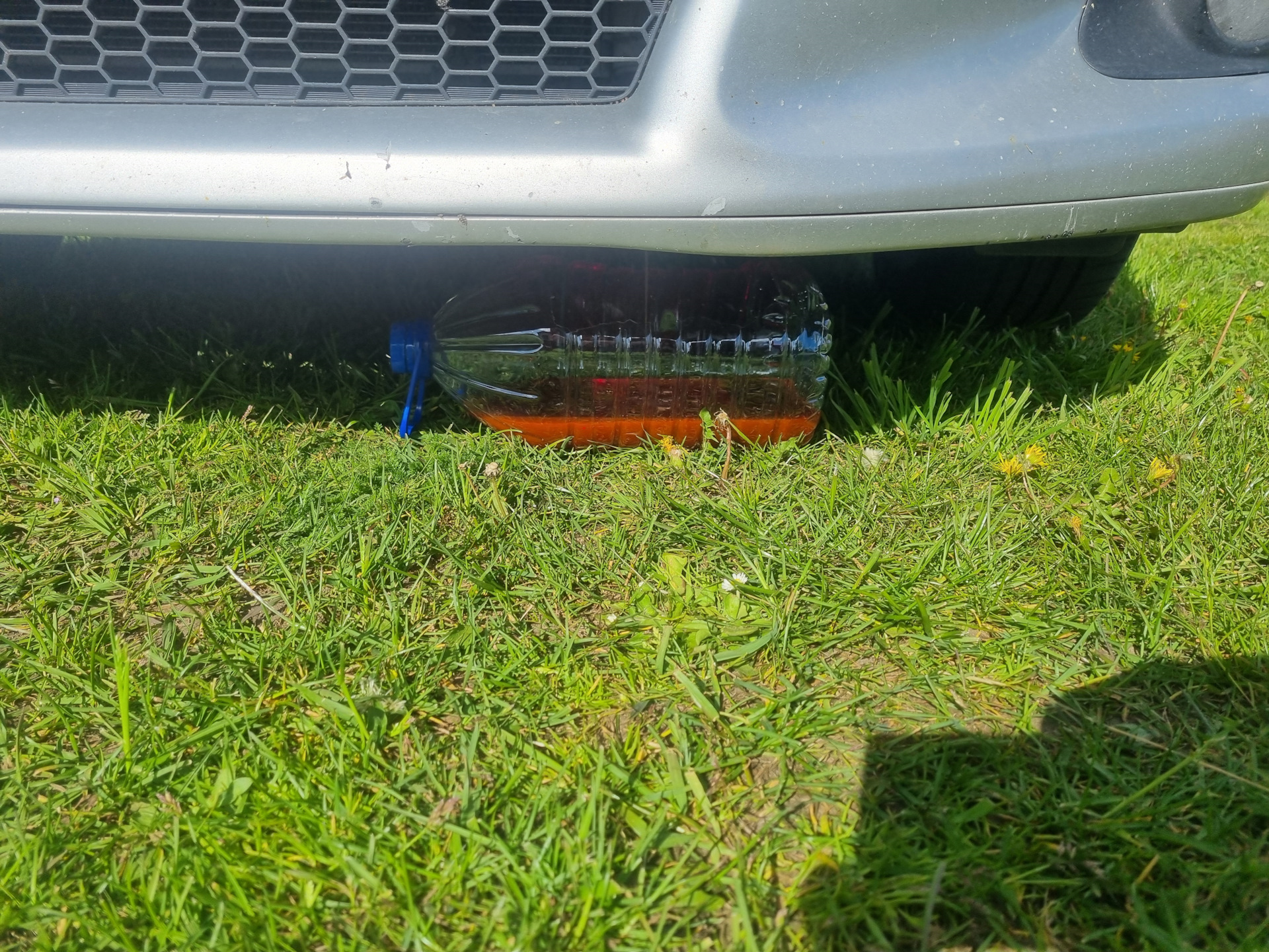 Затем снимаем пластик подкапотного пространства который укрывает радиаторы и аккумулятор, для того что бы добраться до краника слива антифриза кто то снимает аккумулятор, у меня рука достала без снятия, затем из 5 литровой пластиковой бутылки вырезаем верх и подставляем ровно по центру отверстия в пластиковой защите, краник который находится примерно под аккумулятором, открываем его так что бы добиться того, что бы струя была ровная. Затем открываем крышку расширительного бачка, что бы лучше лился антифриз. У меня вылилось примерно 5,3 литра, поэтому следим за уровнем бутылки и когда подходит перекрываем краник достаем из под машины и подручной кружкой выливаем через воронку в другую чистую тару. По необходимости можно и заменить антифриз, в моем случае он был чистым и прозрачным.