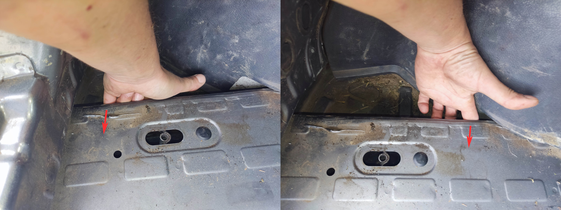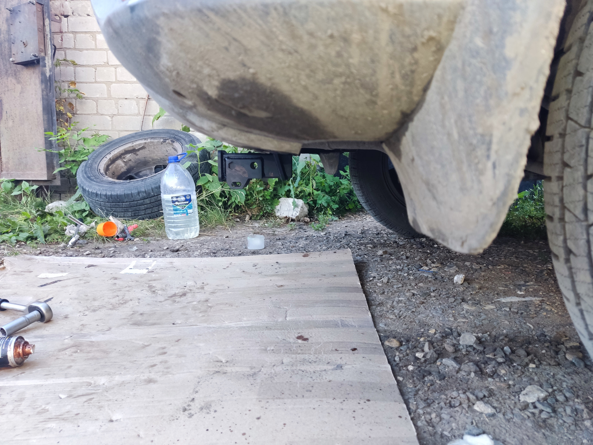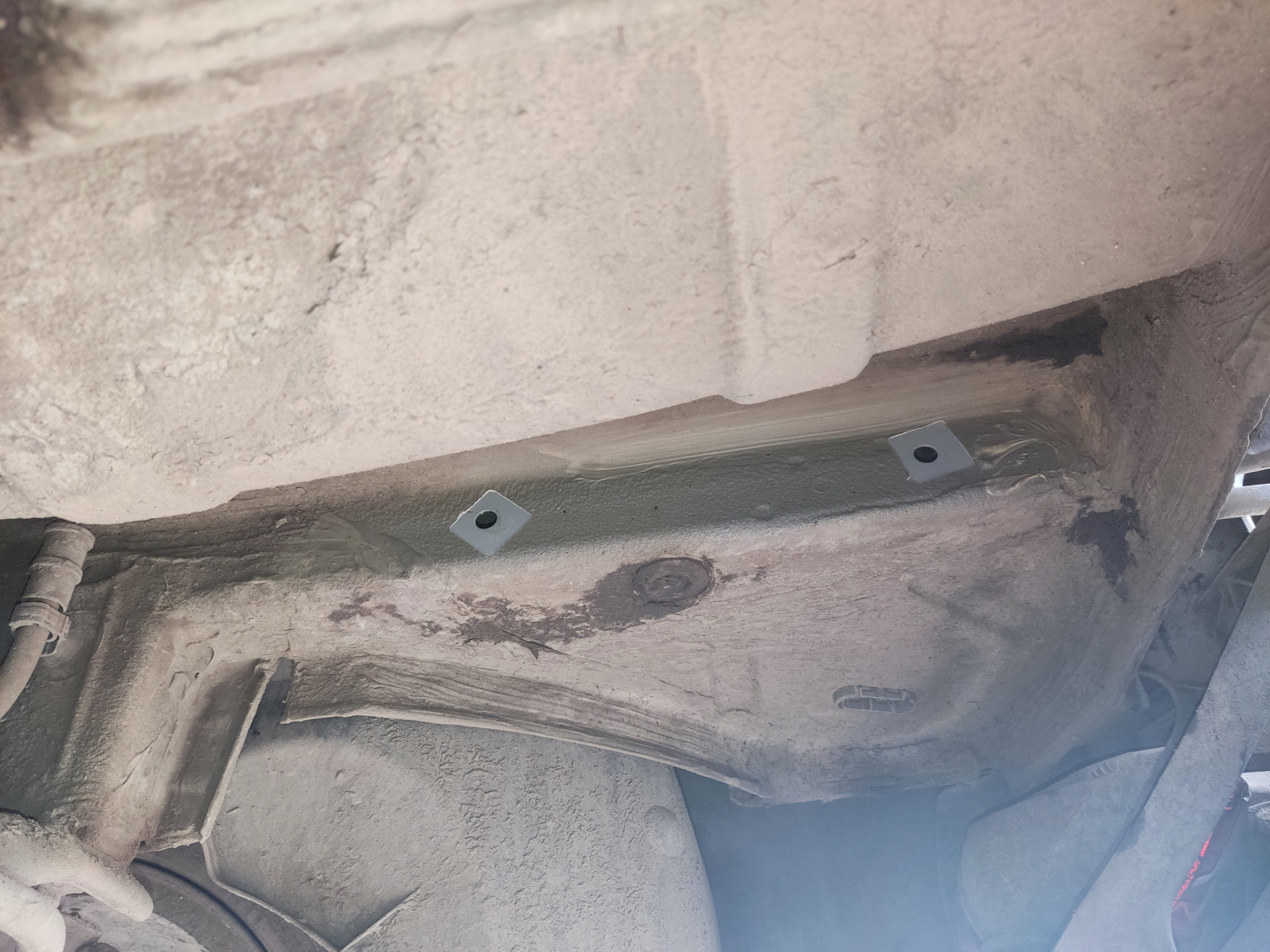 Теперь лезем под днище автомобиля, под багажник, находим и сдираем технологические наклейки, закрывающие отверстия под крепежные болты. Наклейки выполнены из пленки и находятся под слоем заводского антикора. Я дополнительно обрабатывал эти места антикором из баллончика. Расположение наклеек показано на фото.