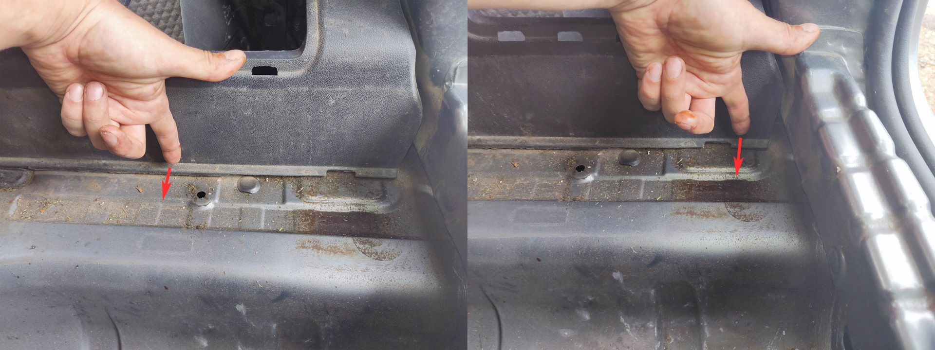 Для начала нужно удалить пластиковые заглушки со стороны багажника. С правой стороны нужно снять пластиковую крышку для доступа к нише домкрата, а с левой вытащить ворсовый коврик. Расположение заглушек и отверстий под болты относительно лонжерона показано на фото.