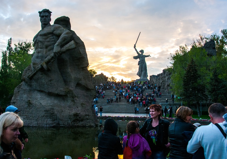 На самом кургане я уже был пару лет назад, но в праздник, как мне казалось, там должно было быть множество тематических акций, оркестры военных лет, еще что то, чтобы прочувствовать праздник. Но, как и в остальных местах, мы не встретили там ничего, кроме угрюмых торгашей. Салюта с Мамаева кургана мы тоже не увидели, точнее, судя по удаленности, нам удалось увидеть с него салют в соседнем городе. Туалетов, как водится, для тысяч посетителей мемориала не предусмотрено. Вообще, сложилось впечатление, что власти города не сделали ничего, чтобы достойно отметить юбилей победы в одном из главных городов-героев страны. Да что там говорить, даже состояние дорог и тротуаров в Волгограде — одно из худших, если не самое худшее, которое я встречал в своих путешествиях по нашей стране.