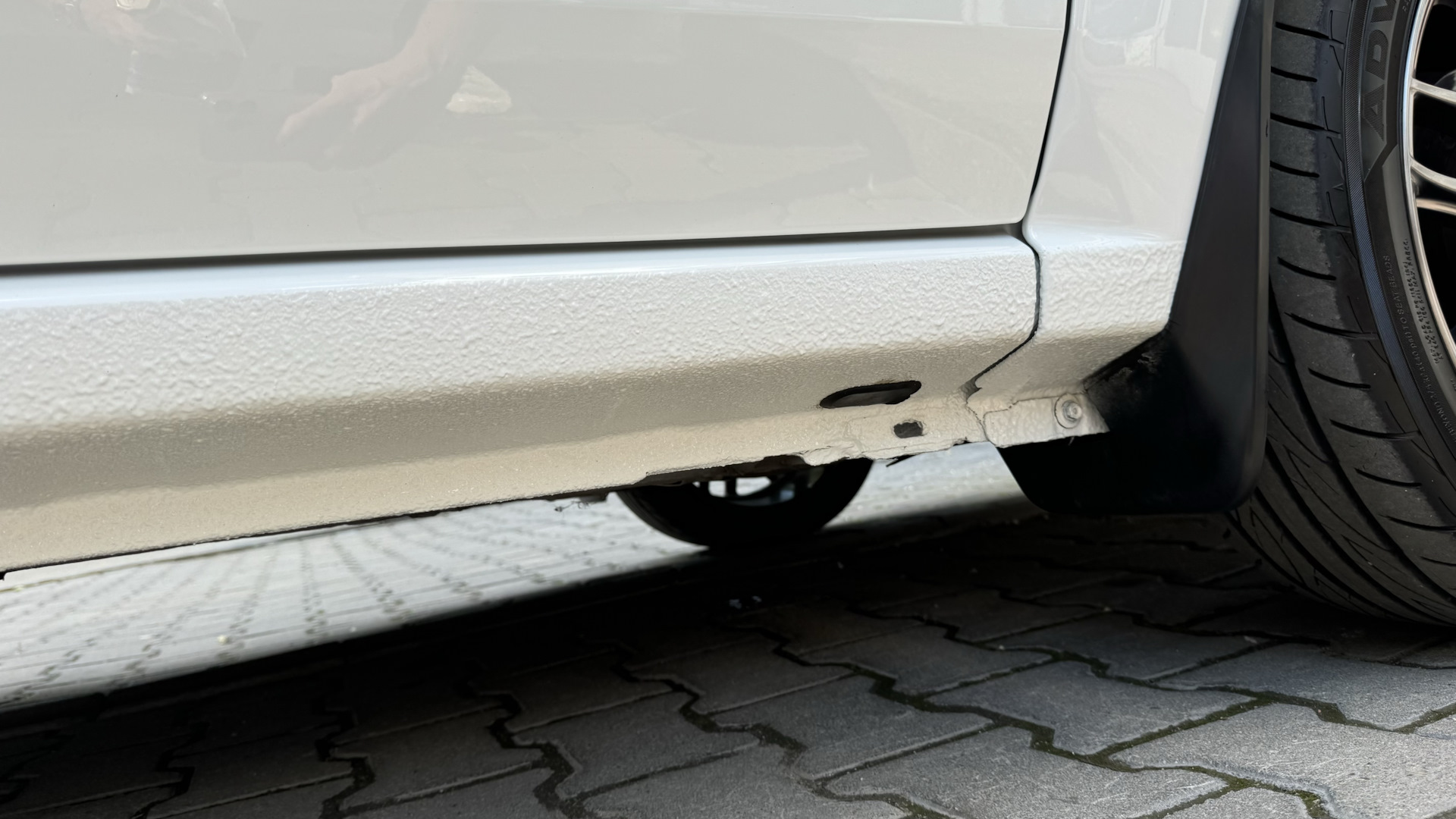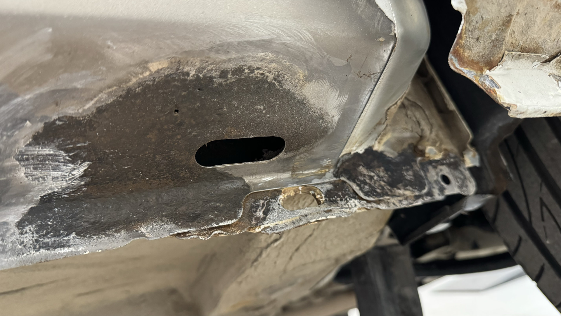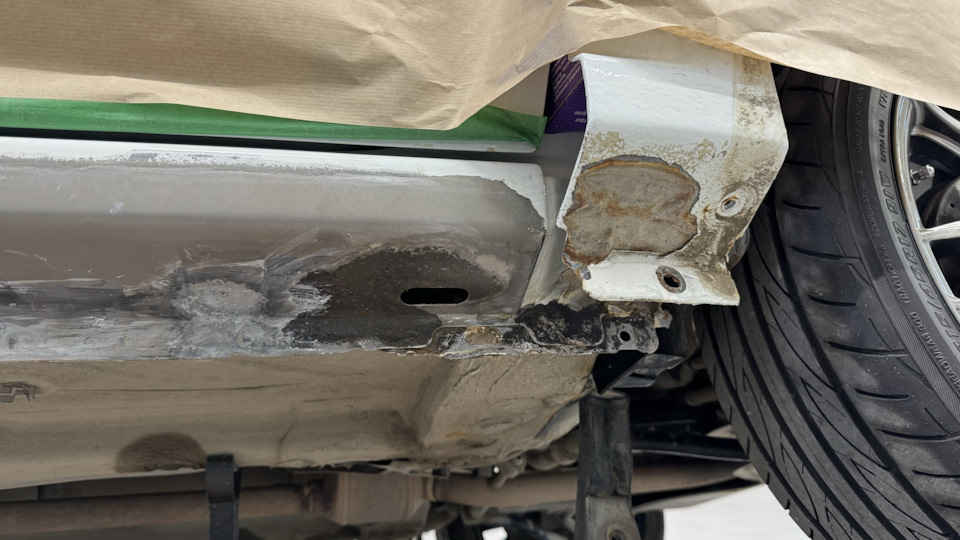 Зачистив краску на порогах, оказалось что все даже хуже чем казалось. Пороги возле дренажных отверстий спереди можно уже было при желании проткнуть отверткой.