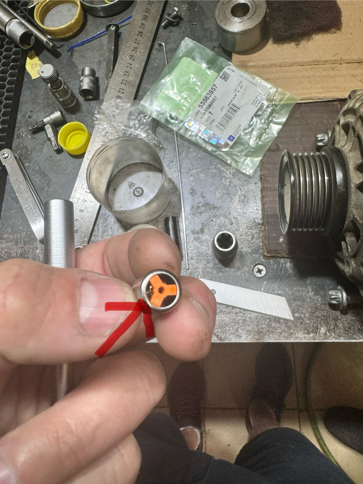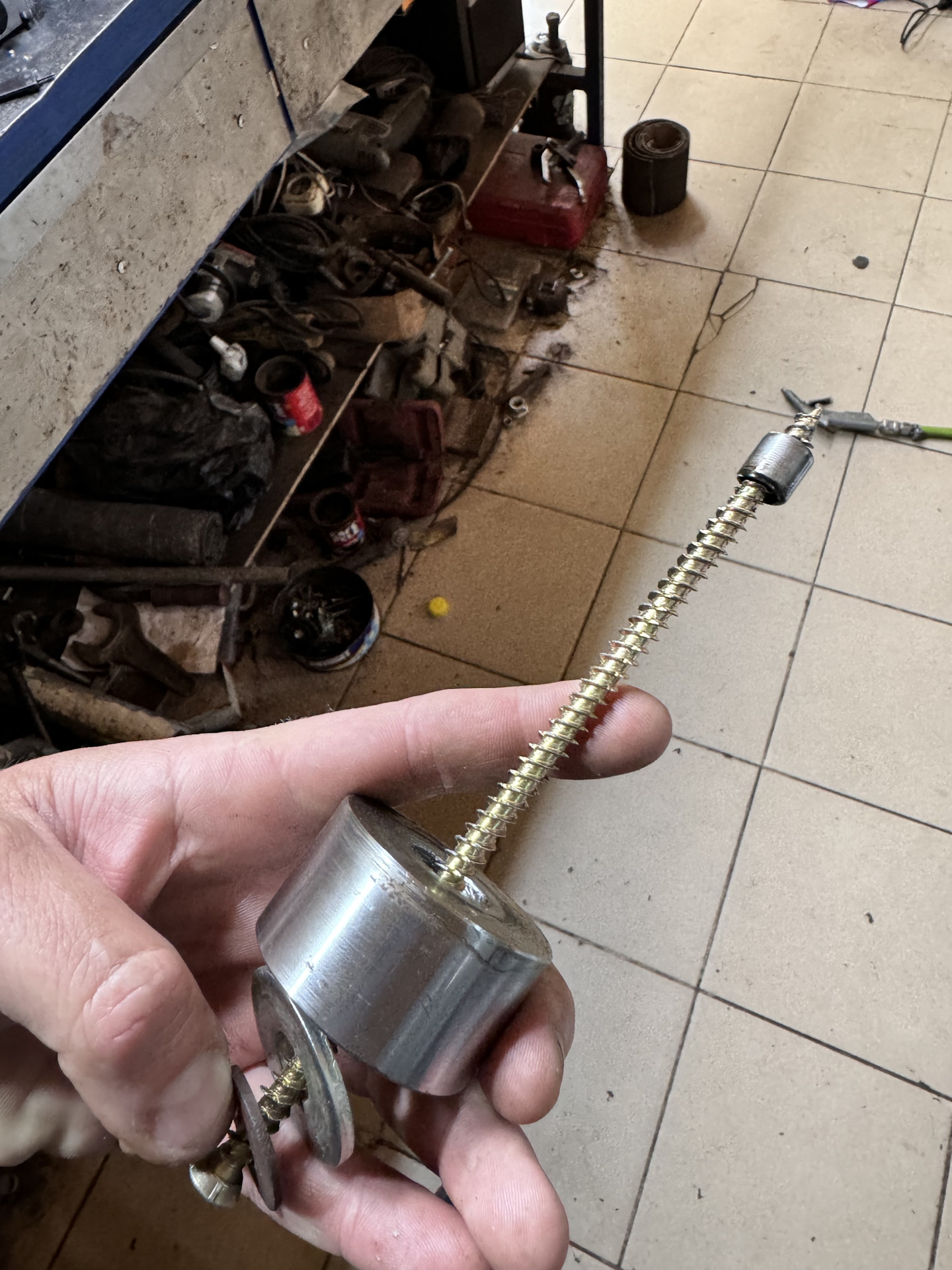 Далее достал пружину и шарик магнитом прочистил крошки пластика потом взял строительный нагель 7 мм длиной 182 мм на него поставил шайбу и тяжёленкую металическую проставку потом вкрутил в клапан пока легко не начал вкручиваться и проставкой выбил с 3-4 раза. Выбивал от блока в сторону генератора.