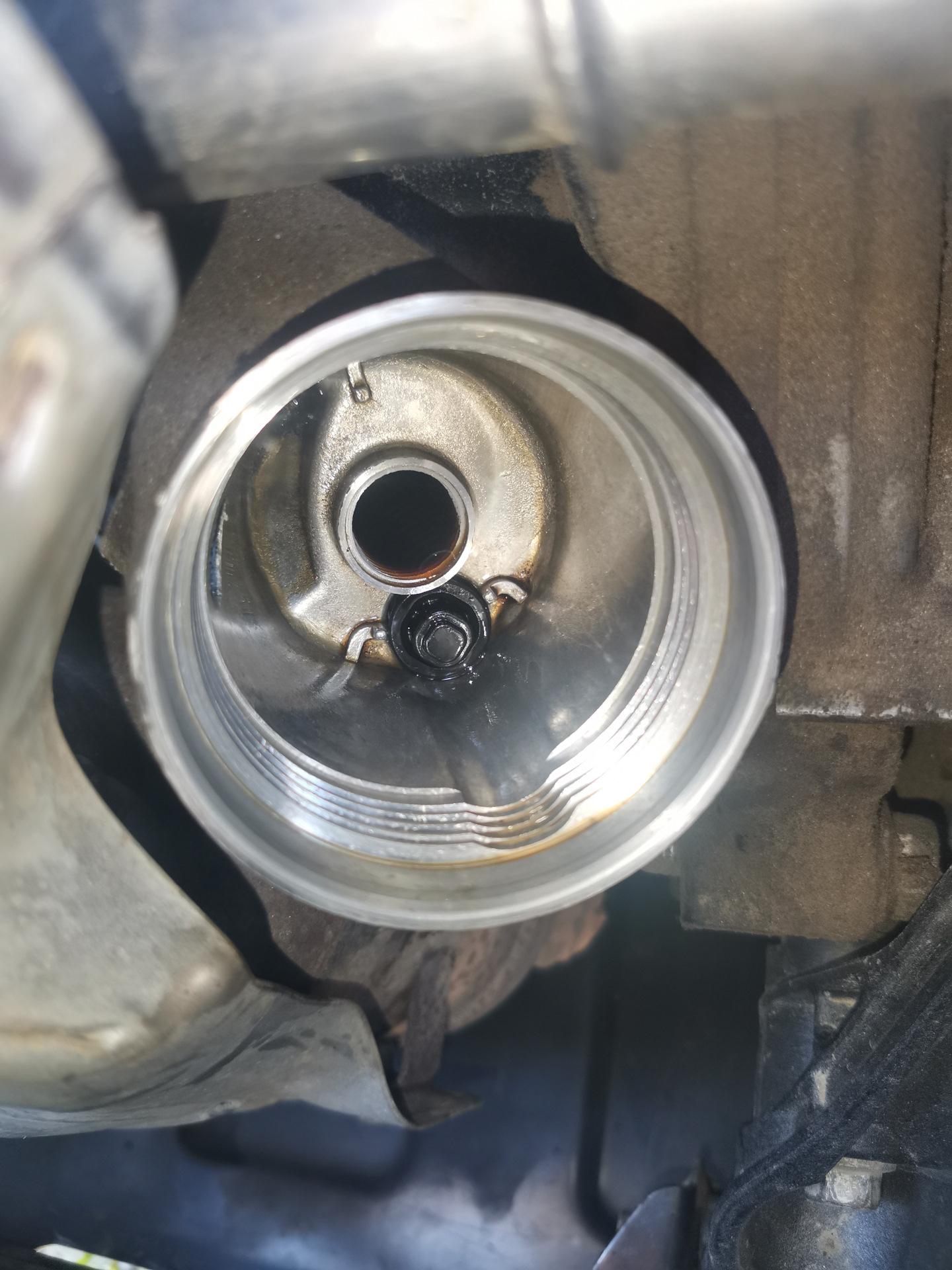 👉Далее снял масляный фильтр и пластиковый клапан который стоит в центре фильтра и продул компрессором у меня мусора не было. Со стороны клапана вплотную в отверстие поставил бутылку 1 литр согнутую так как масло нормально от туда летит и тряпки точно не спасут.