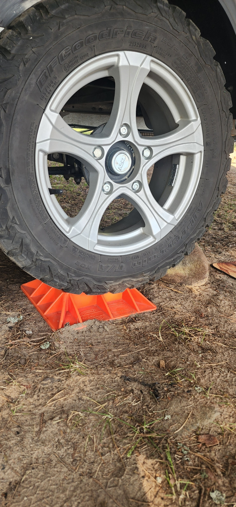 Выбрали полянку. Встали. Немного кемпер стоял под наклоном, под колесо для выравнивания пошла площадка под хайджек.