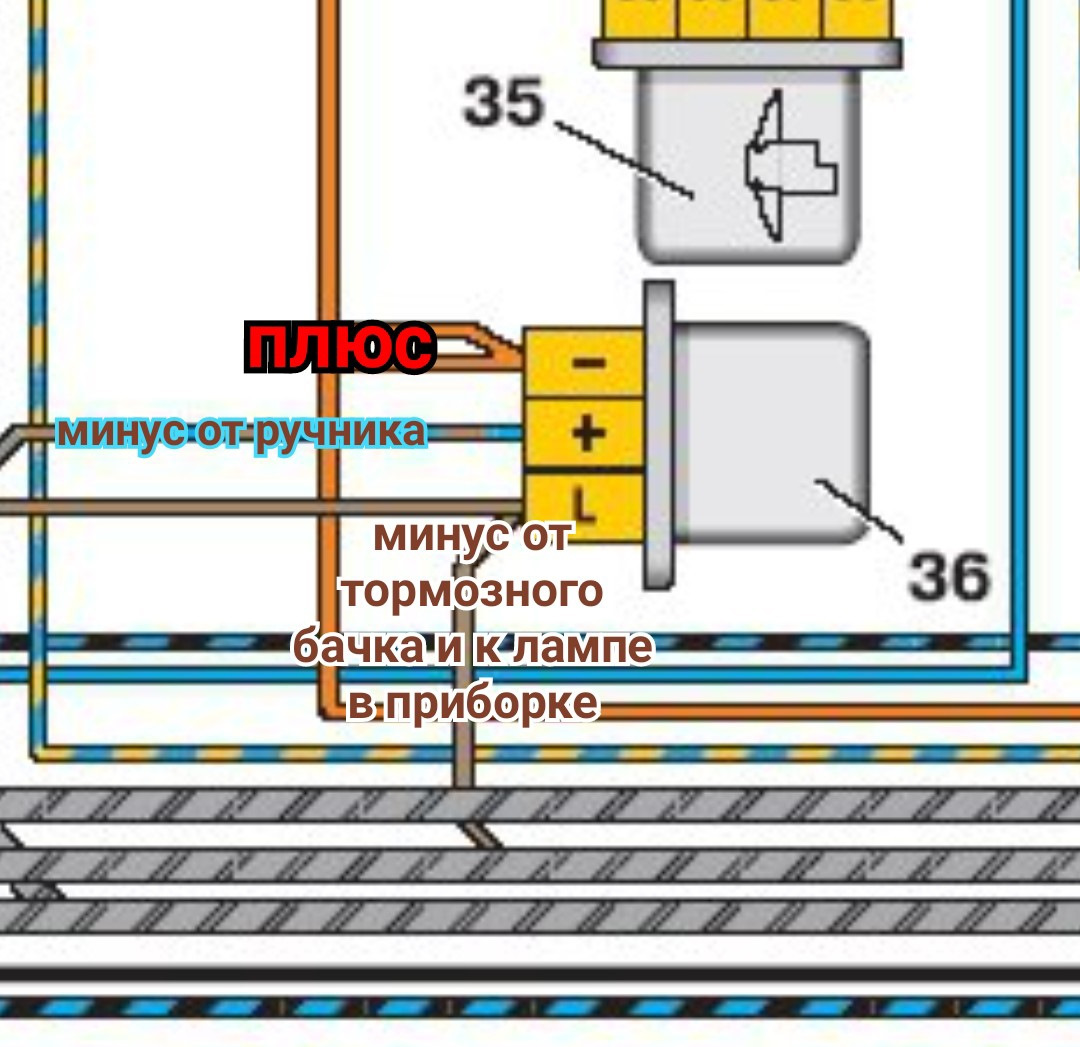 А на плюсовую клемму реле, приходит минус от концевого выключателя на ручнике.