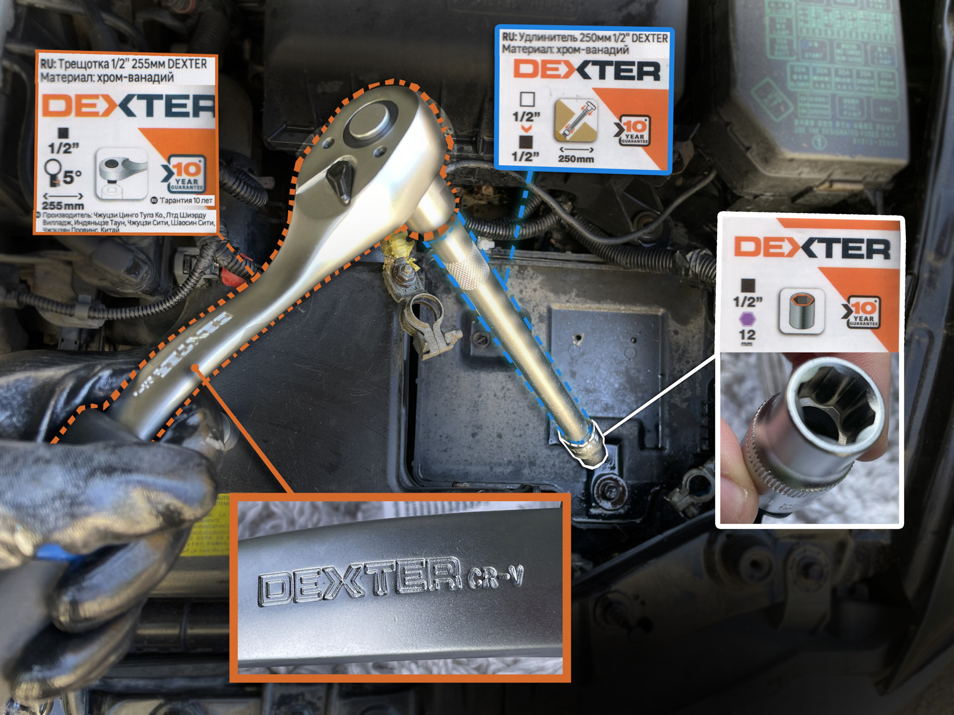 Дабы выкручивать и закручивать защиту нам понадобится инструмент, заехал снова в Леруа и приобрёл кайфовую трещётку Dexter, удлинитель и набор бит, теперь можно крутить!