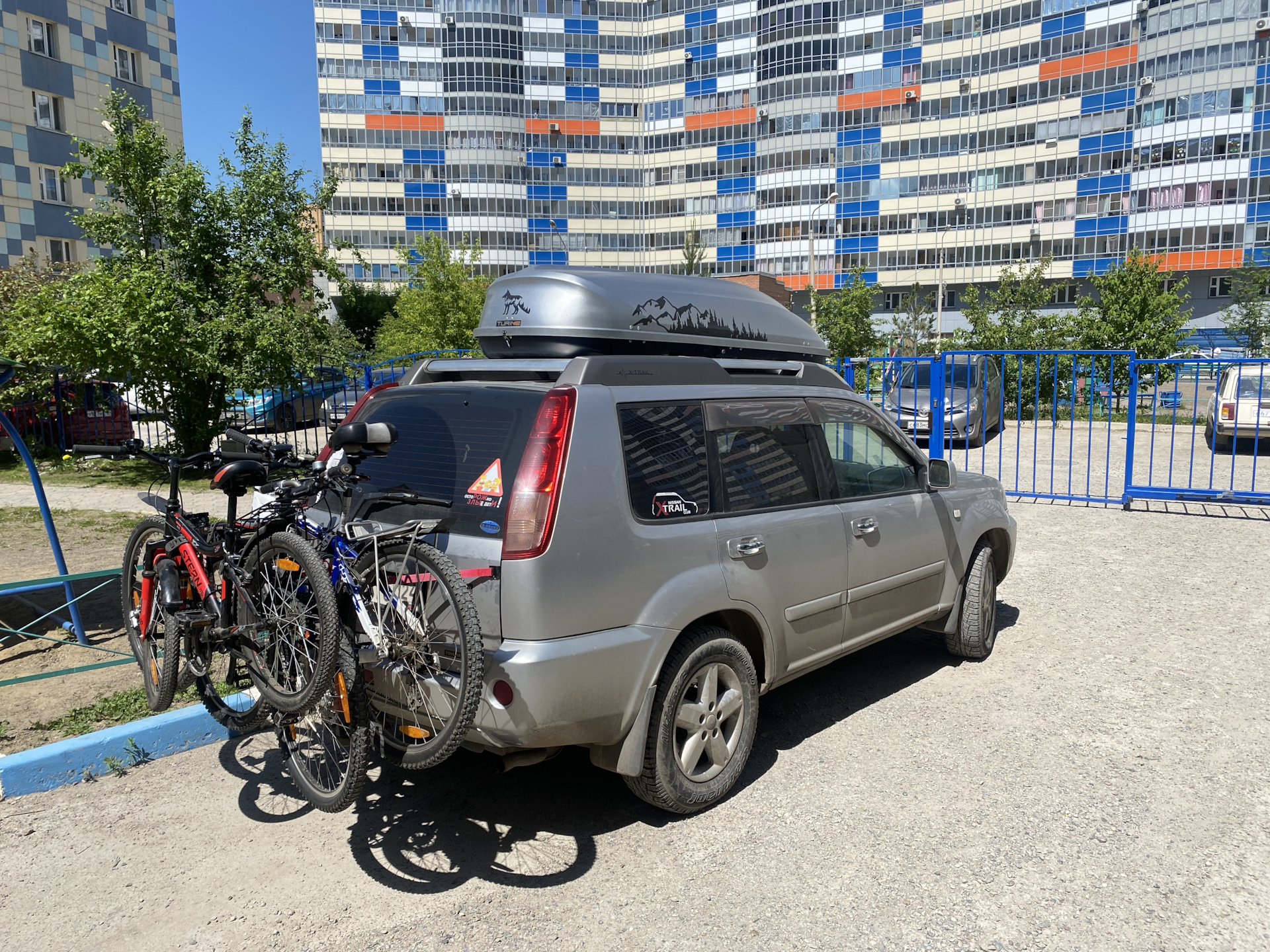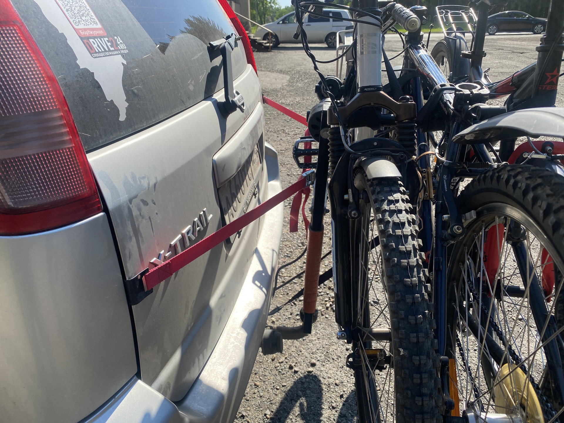 В итоге на обратном пути я осмелел и шёл уже со всем этим безобразием сзади и на крыше 110 км/ч. Расход показал мгновенный +/- 10 литров/100 км. Ничего не отвалилось — главное всё прочно закрепить стропой. И я бы ещё сделал два дополнительных крюка на верхнюю часть двери багажника, а не только по бокам. Посмотрим, может в ближайшее время доработаю, так как летом велам предстоит доехать на этом багажнике до Хакасии.
