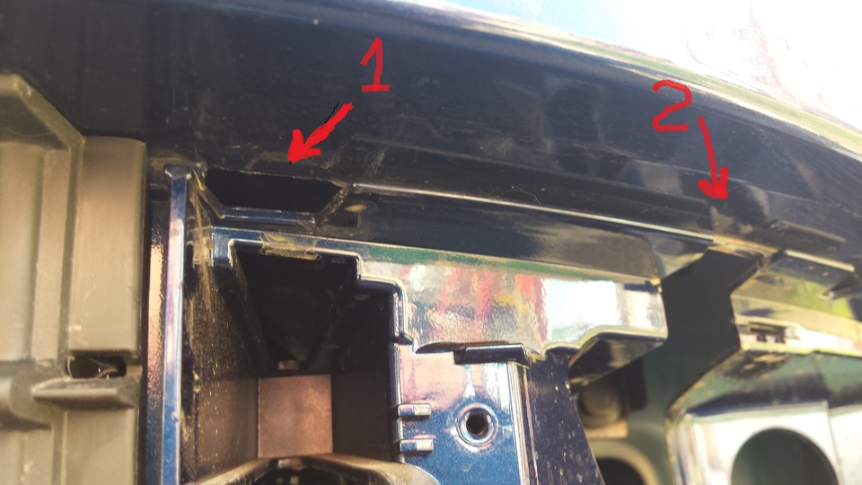 Теперь подробно про демонтаж решетки. Я начал с левой стороны. При помощи щипцов и отвертки аккуратно поддеваем усик заглушки левой противотуманной фары, в верхнем левом углу на расстоянии 25 мм от самой решетки просовываем отвертку (должны попасть в усик на фото) и рядом просовываем щипцы и после щелчка поддергиваем на себя щипцы и вращая отверткой размыкаем замок защелки. Далее проделываем все тоже самое с усиком №2. Всего их будет 6 шт.