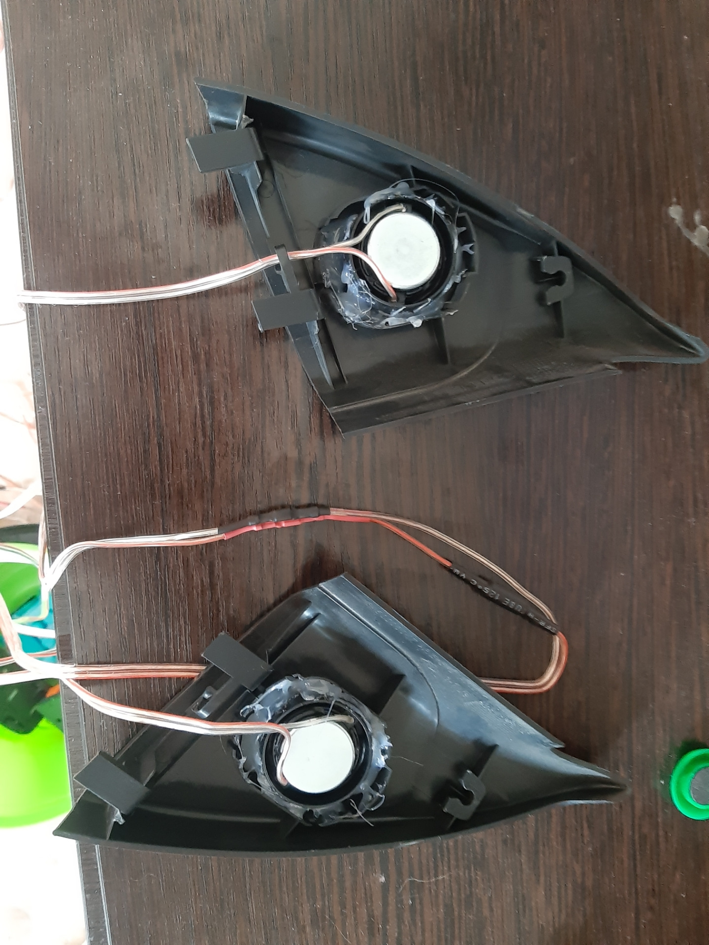 Твиттеры приклеил на термоклей, провода с кондесаторами подрезал, соеденил на клеммы и в термоусадку.