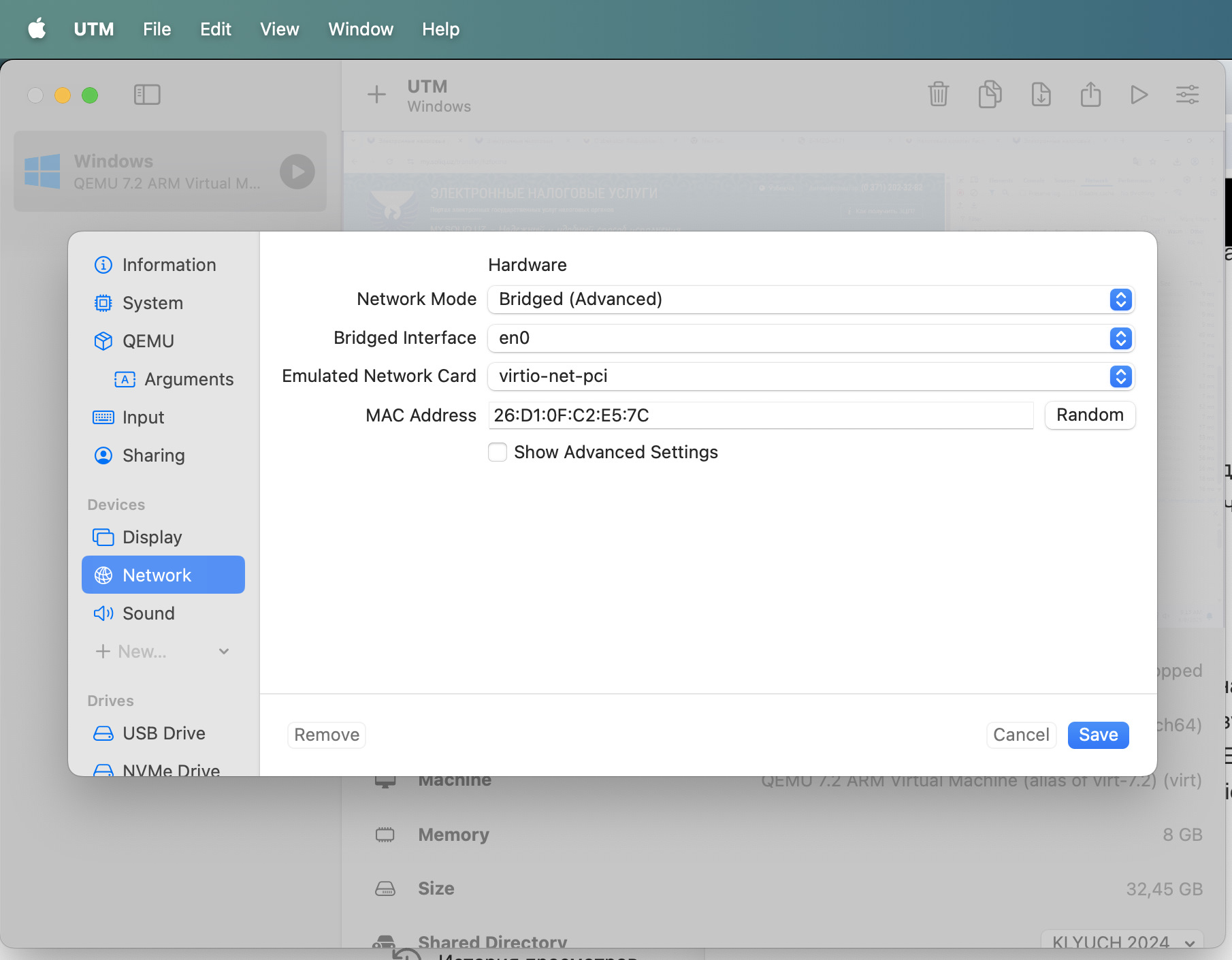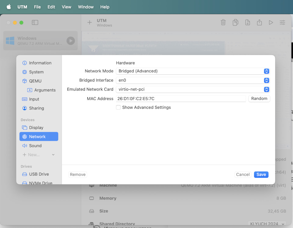 Не затруднит ли Вас ответить, где именно выставляется "Network Mode: Bridged (Advanced)"? У меня по такому же сетапу как у вас но не запускается