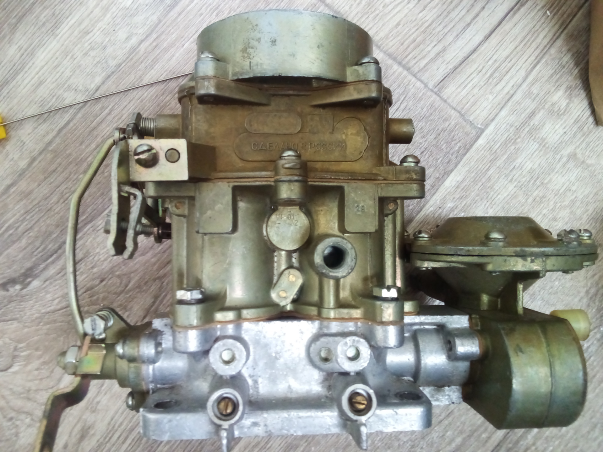 ДААЗ 4178…-40, волговская модификация. Куплен бу в очень даже хорошем состоянии. Отличается от уазовского -10 или -30 другим МД 1 камеры, чуть другими жиклерами, а также тем, что сделан изначально под тросик, а не тяги. А ещё тут есть слив топлива для обратки. Полноценную обратку ещё не реализовал, есть задумка сделать обратку прямо в бак, уже более года как куплен заборник топлива с обратным сливом от карбюраторного соболя, но руки не дошли до внедрения.