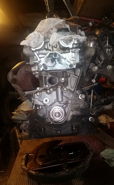 АКПП была отцеплена, а двигатель вывешен в подвале гаража по центру (три доски друг на друга положены поперёк ямы. Через них прокинут ремень и на нём на лебёдке вывешен мотор для удобства поворота вокруг вертикальной оси)