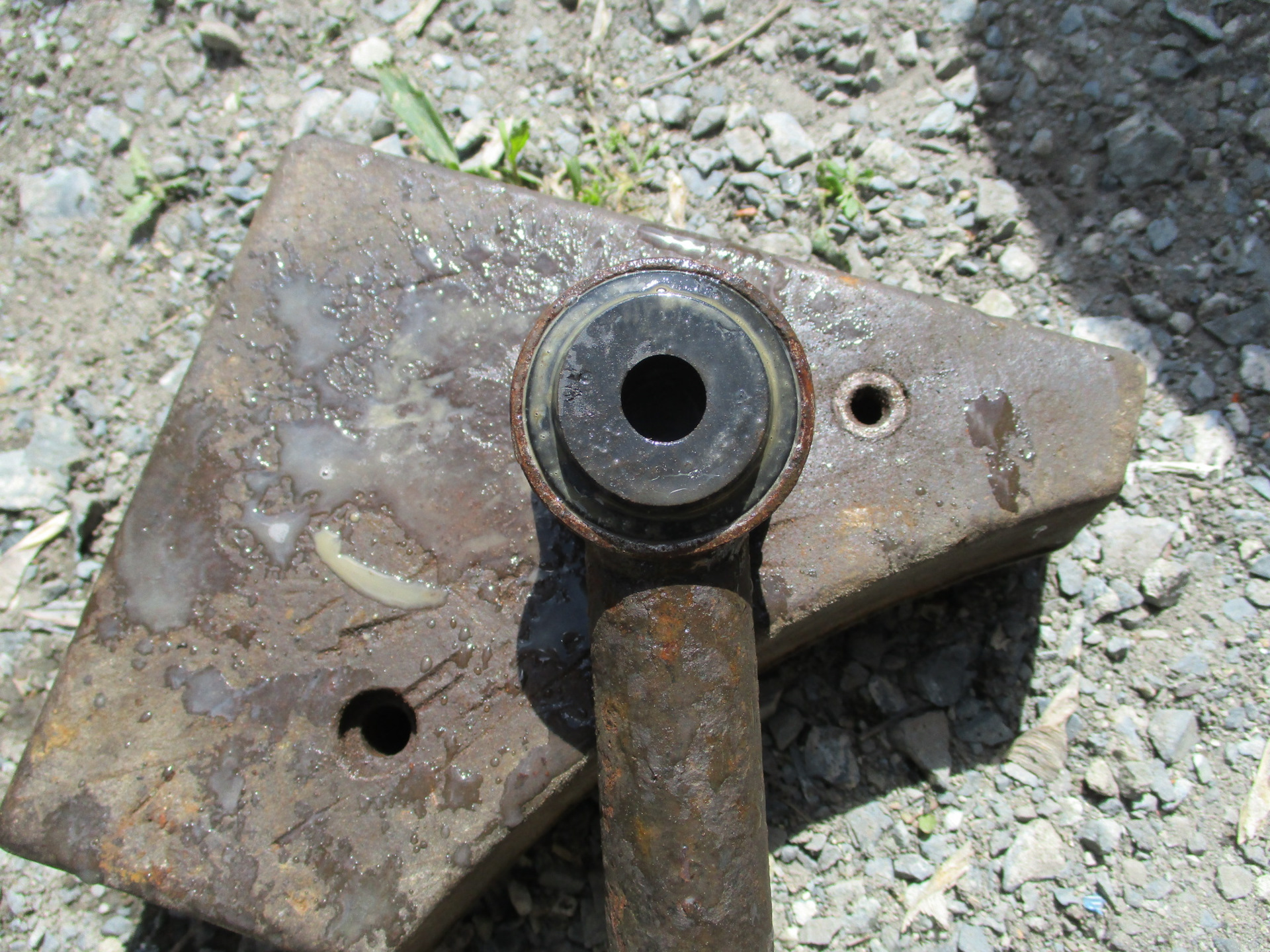 круглым напильником(наждачкой, песком, кирпичём и тд) удаляется остатки резины и начало ржавчины, рядом заранее припасённый кусок