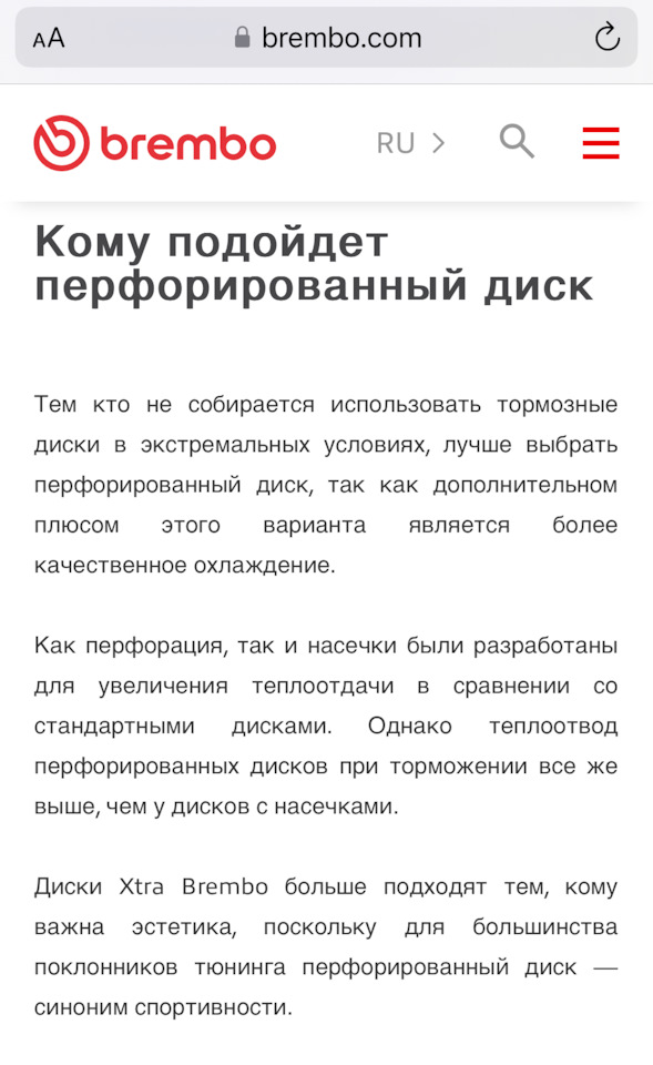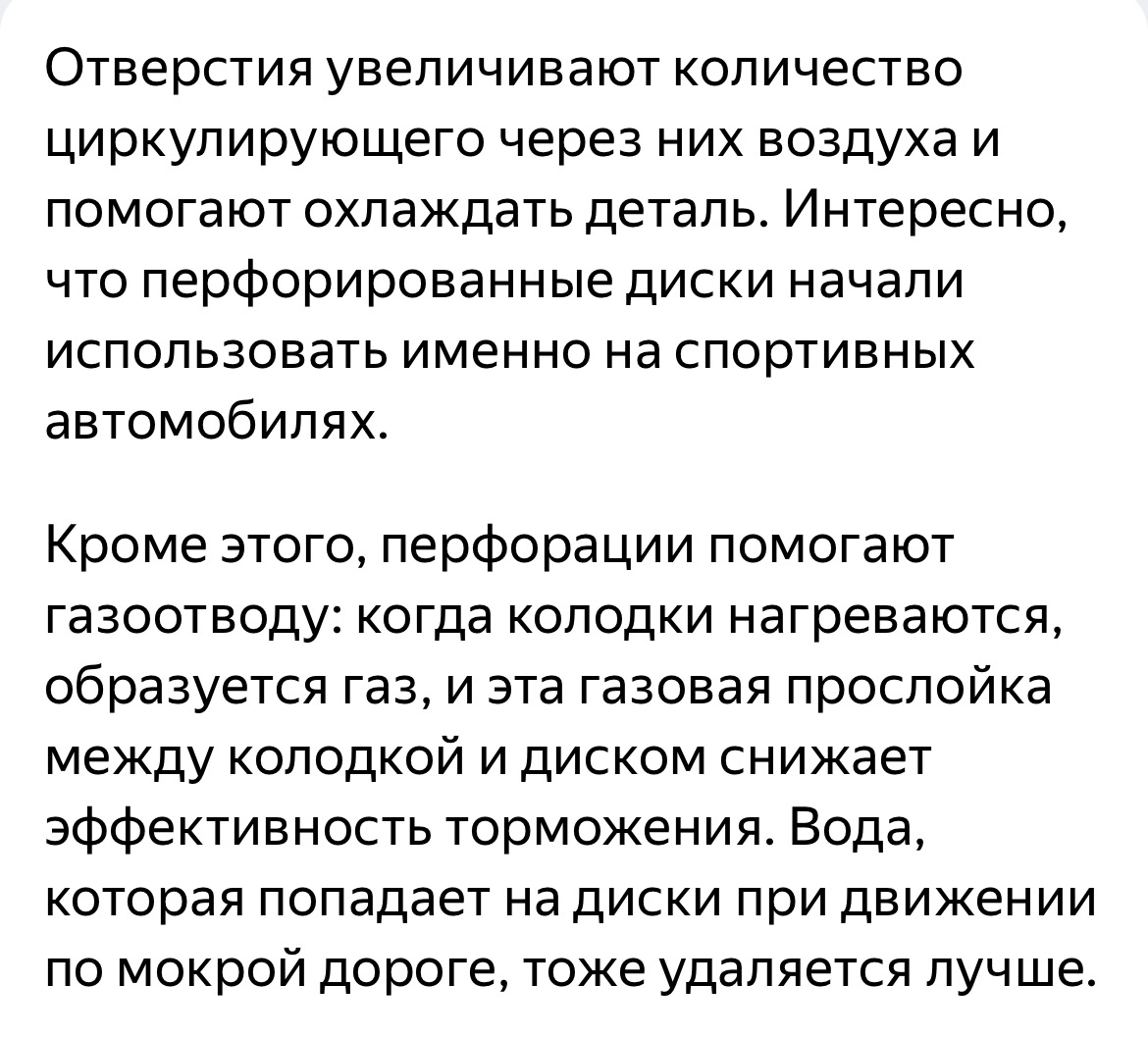 О чём и речь) 200-300°С для сплавов железа — это детская температура. От нагрева чугун деформируется при таких температурах, при которых гражданские колодки уже не дымят, а воспламеняются. Перепад температур — отдельная тема. Возможен ещё такой дефект диска, как трещина в перемычках — тогда и диск ровный, и биение есть. Этот дефект может вылезти как раз при умеренном нагреве (прогретый до данной температуры диск увеличивается в диаметре примерно на 0.5-0.7мм, если половинки диска плохо сварены, могут треснуть по шву). Учитывая, что проблема со штатными дисками на конкретной модели — вполне вероятно, что была косячная партия дисков. В этом случае надо было просто любые не оригинальные диски поставить. Ну а перфорация нужна только если тормоза часто ватными становятся и практически никак не влияет на температуру диска. Байки про лучшее охлаждение идут от того, что с перфорацией перегрев КОЛОДКИ не так ярко выражен за счёт отвода газовой подушки и снятия стекла с колодки острыми кромками, поэтому такие диски при нагреве тормозят лучше. А охлаждаются они лучше настолько, насколько увеличивается площадь поверхности при сверлении — то есть на 1-2%. В автоспорте перфорация встречается нечасто, не из-за "ненадёжности", а из-за того, что не имеет особых преимуществ перед хорошим слотированием. А там где встречается, то сверление там очень сильно отличается от гражданских "тюнячек". В карбоновых дисках Ф1 больше 300 отверстий, мотоциклетные диски на спортбайках тоже все дырявые как решето — такое сверление увеличивает площадь теплоотвода уже на 20-30%.