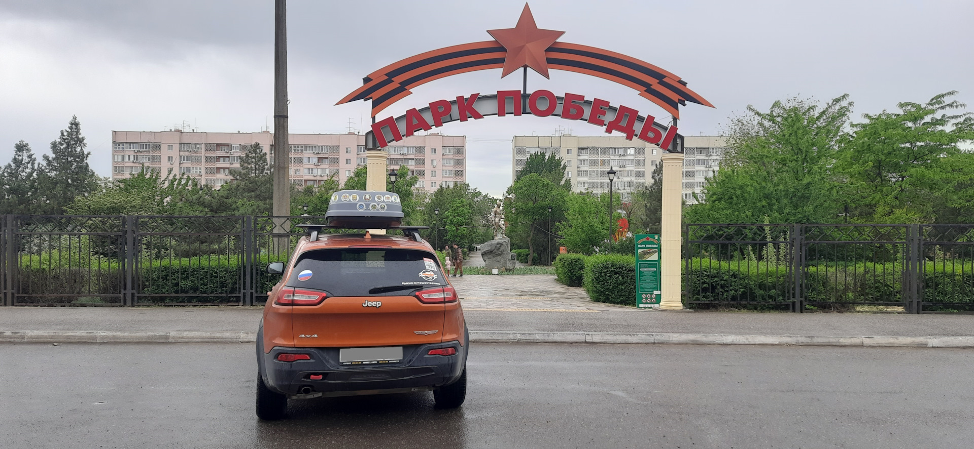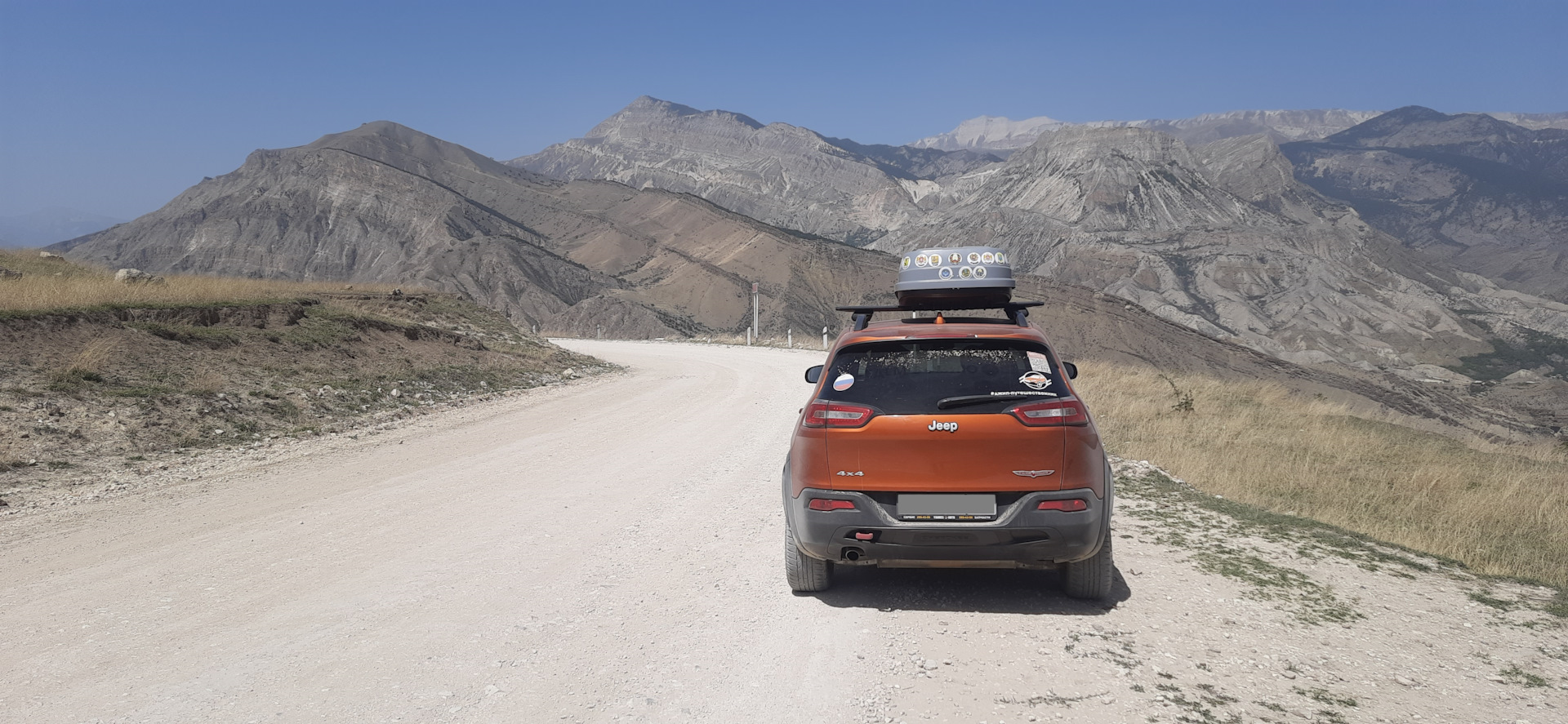 В Элисту прибыли ближе к вечеру. Погода как назло начала портиться и после Дагестанской жары +37 градусов, мы получили всего лишь +10 и нудный дождь. При заправке на Лукойловской АЗС обратил внимание, что бокс на крыше Ящера стоит чуть ли не по диагонали. Пришлось ослаблять крепления и центрировать его. Сначала подумал, что это из-за степных ветров в Калмыкии, но уже потом, перебирая фотографии обнаружил интересный кадр из Дагестана. Оказывается, последние пару дней я так и ездил со смещенным боксом и даже этого не заметил.
