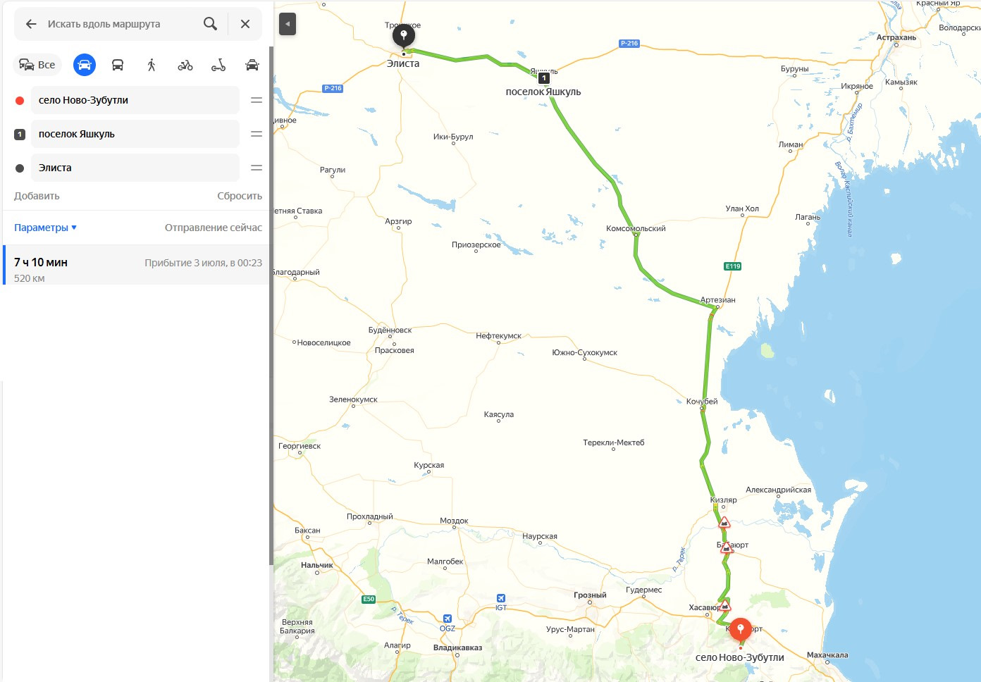 Маршрут: Ново-Зубутли – Хасавюрт – Артезиан – Комсомольский – Яшкуль — Элиста. Расстояние 520 км.