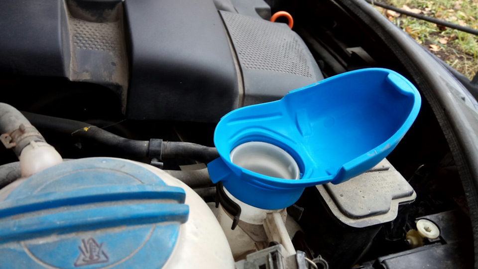 Штатная горловина дурацкая — узкая и расположена низко. Я взял баллон-полторашку, отрезал дно и бросил в багажник. Через этот баллон и заливаю.