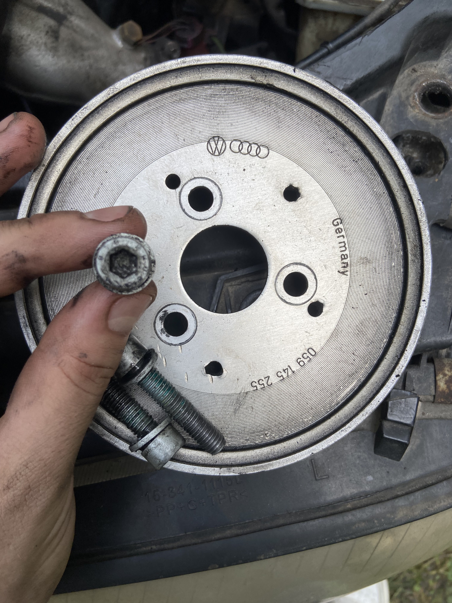 Болты шкива на насосе лучше отжать до снятия поликлинового ремня, иначе потом шкив будет свободно вращаться.