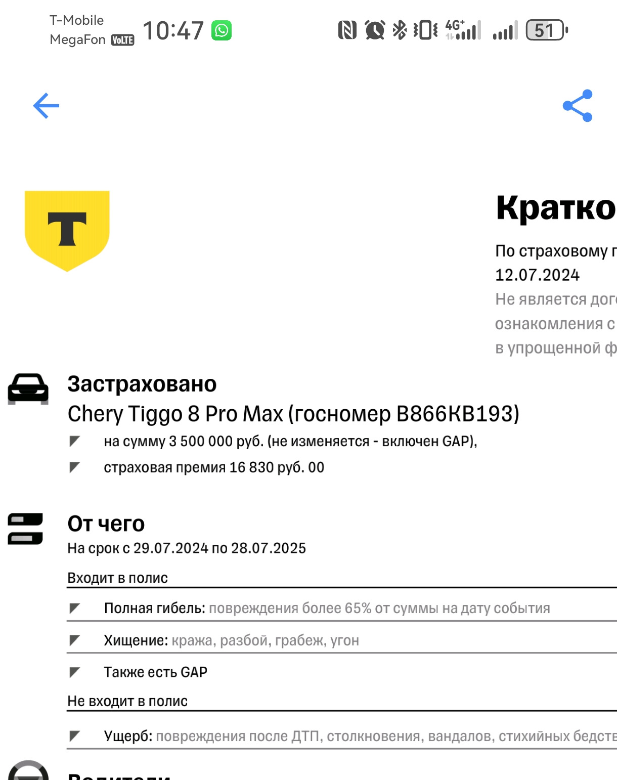 Параметры КАСКО оформленном в Т-Банке: страховая сумма — 3,5 млн. руб., ГЭП (страховая сумма остается не изменой на протяжении всего периода страхования), риски — угон и полная гибель.