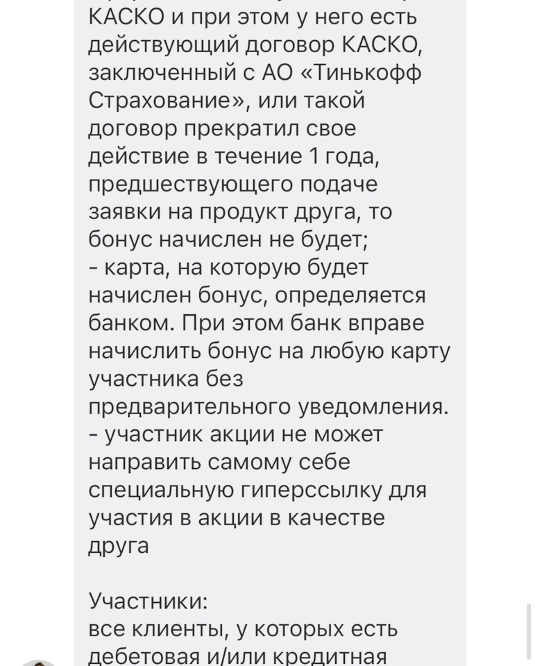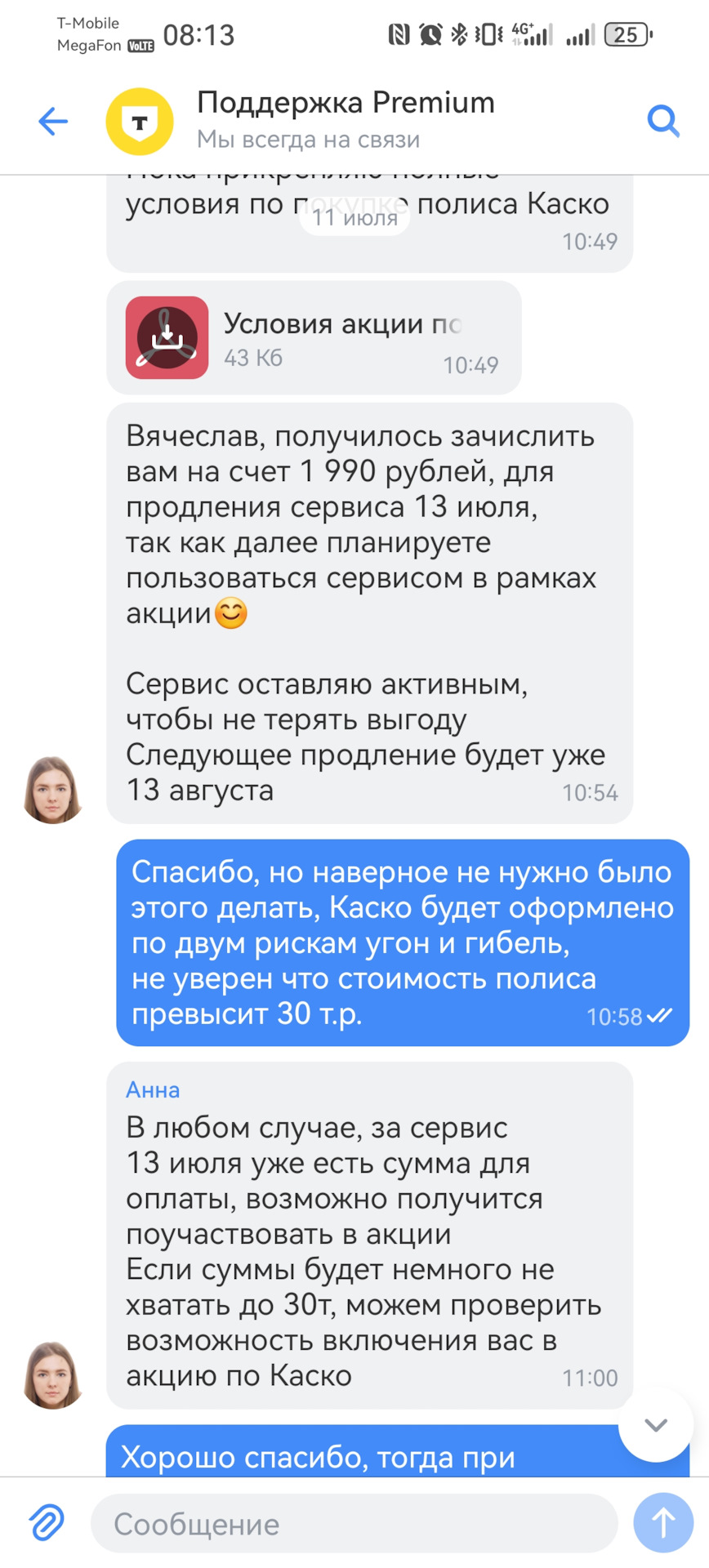 К моменту окончания действия предыдущего полиса, стали поступать звонки — "продлевать будете", из всех предложений наиболее выгодным было предложение Т-Банка, со стоимостью полиса 22 тыс. руб., обговорили условия по телефону и через некоторое время полис появился у меня в приложении банка с пометкой "требует оплаты". Оплатить его собирался в течении двух недель. В это же время, наступает время оплаты подписки Premium, мне она не нужна, пишу в чат банка "Отключите пожалуйста подписку, ее преимущества мне не интересны, к тому же через две недели оплачу полис КАСКО, а по условиям акции при оформлении полиса КАСКО в подарок Premium подписка на год", буквально через несколько минут баланс карты пополняется на 1990 руб. и сообщение оператора "Зачислили вам 1 990 руб., для оплаты подписки на месяц, что бы вы продолжали пользоваться сервисом".