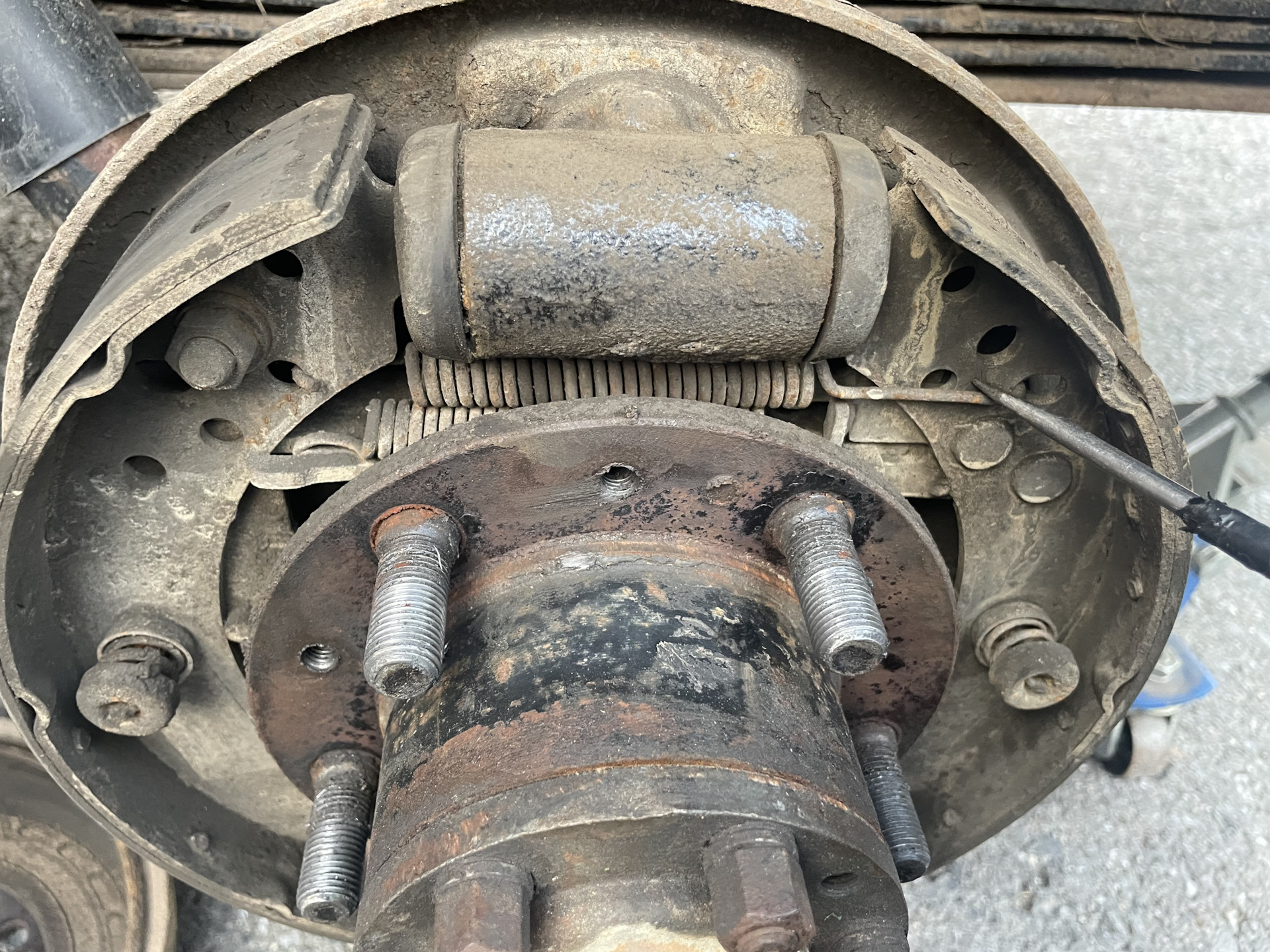 Итак, снимаем колесо, отпускаем ручник, сводим колодки нижними регулировочными эксцентриками. Снимаем барабан, вкрутив три винта на М8.