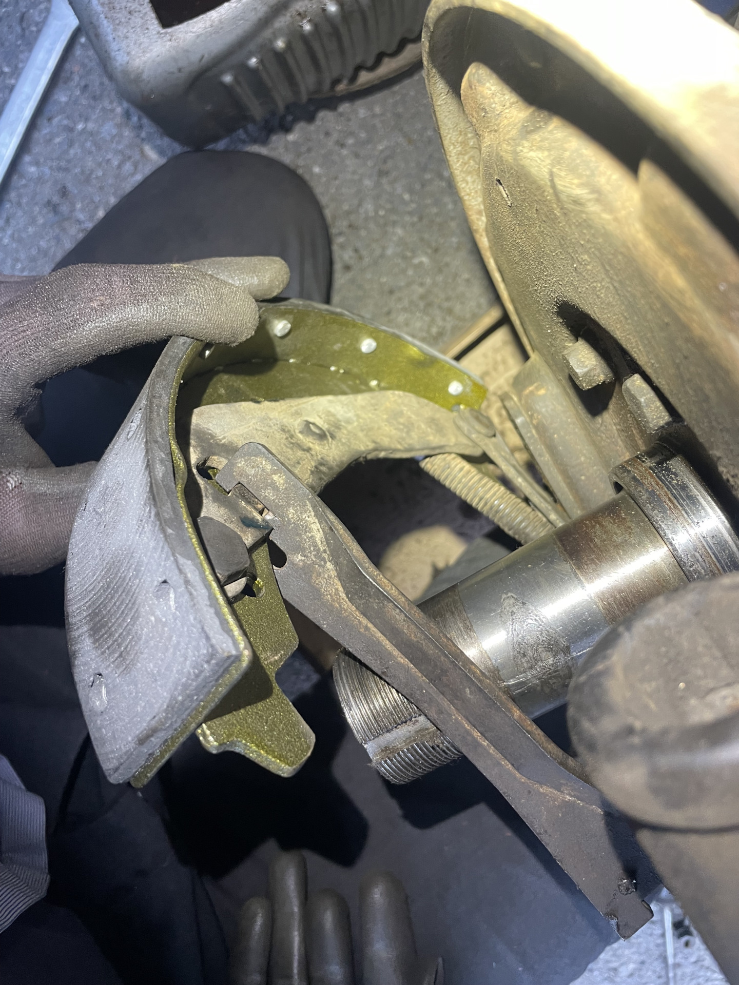 ставим переднюю колодку на место, снизу наживляем эксцентрик, прикладываем заднюю колодку,