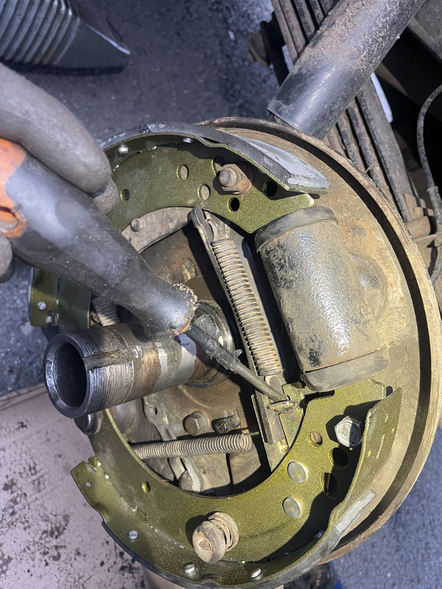 Пока старые колодки на месте, чтобы не портить новые, монтажками упираемся в щит и сводим поршни рабочего цилиндра. Вообще еще более правильным будет просто поставить цилиндр новым.