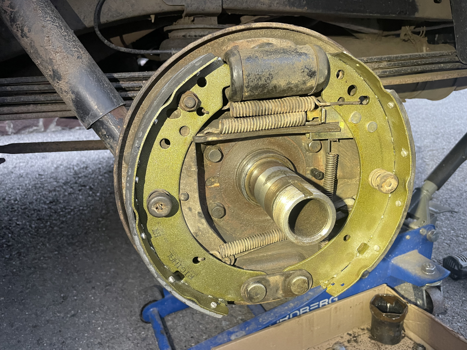 Самым последним — регулируем колодки — помощник жмет на тормоз, в этот момент крутим эксцентрики до момента касания колодок. После чего затягиваем окончательно стопорные гайки.