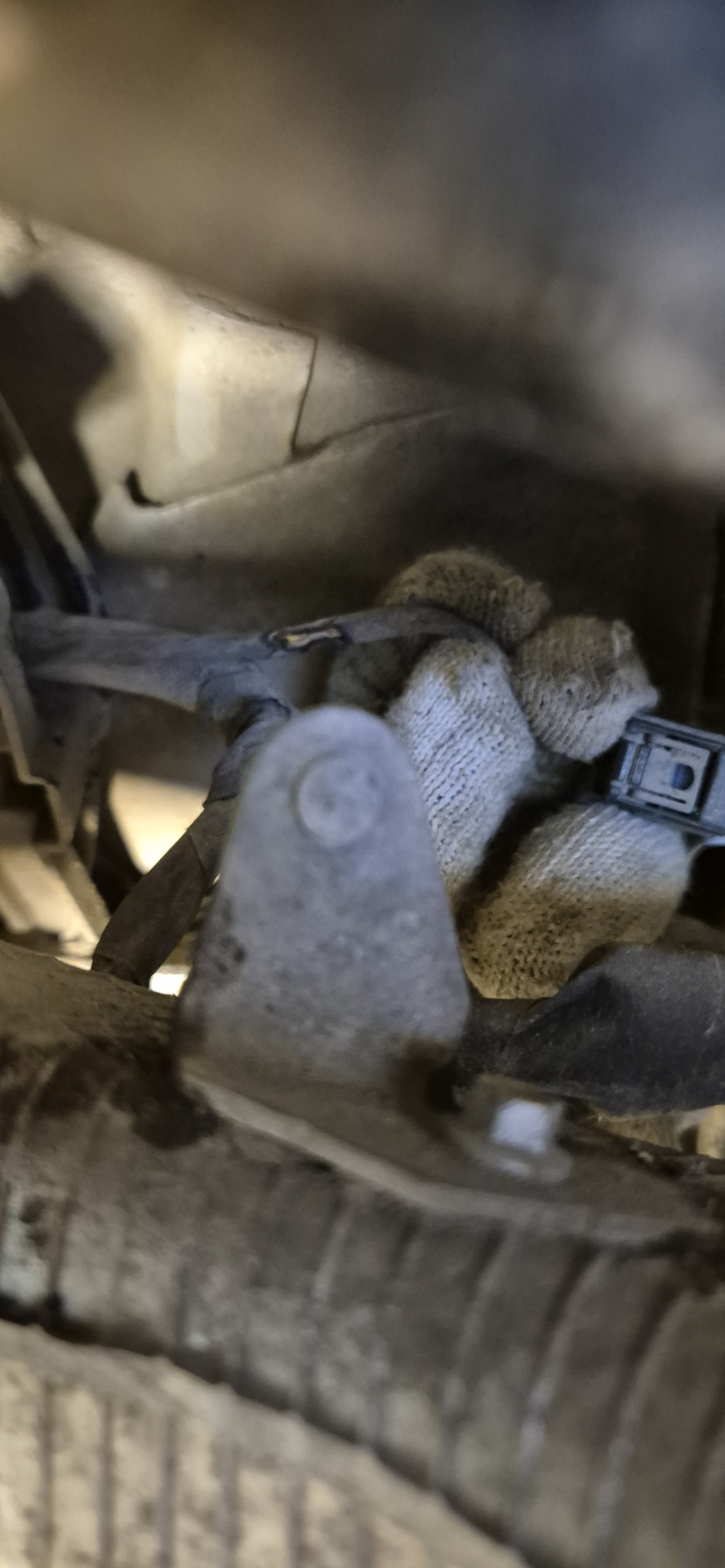 Заехал в итоге себе в гараж на осмотр этой проблемы. Снял сначала задний датчик положения — шевелится, не закис. А вот при осмотре проводки к нему и нашлась проблема. Один из проводов тупо перетёрся об рычаг. Прям совсем. Все родные хомуты и его крепления на месте. Ктож так делает то?