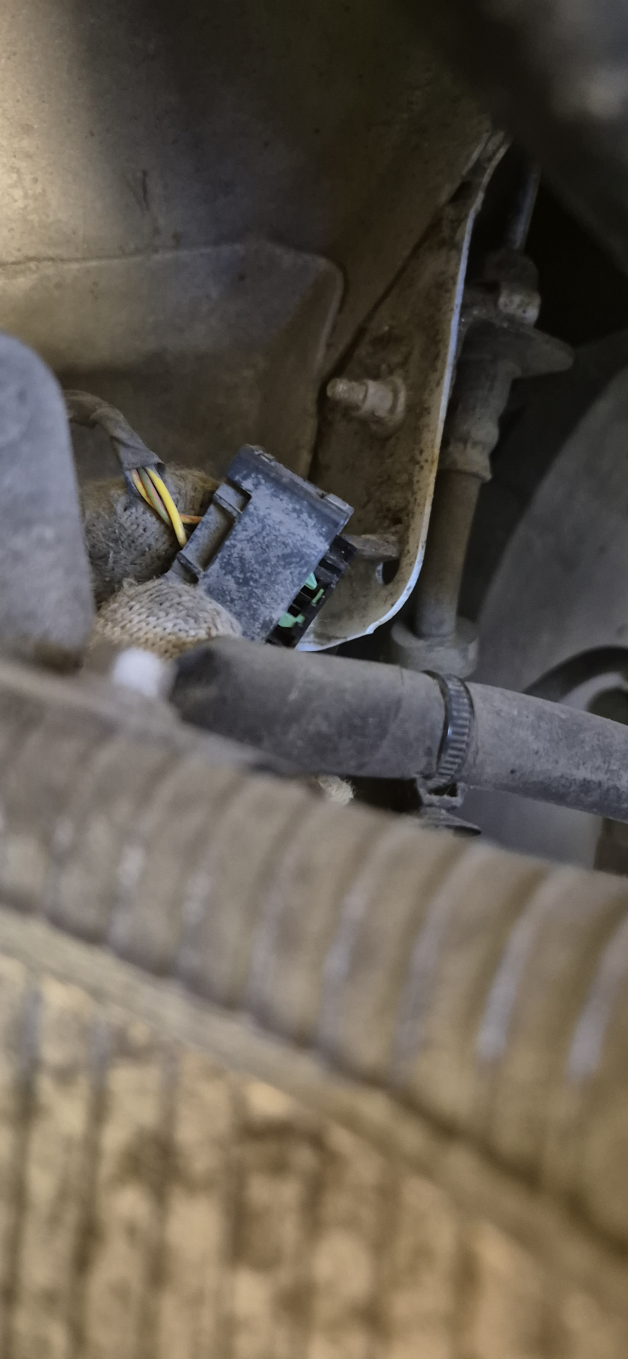 Тот что я делал — в районе заднего нижнего большого рычага, через тягу соединён с кузовом. Провода на хомутах прям к рычагу "припистонены". На фото обведено к чему тяга грепится. В передней части тоже есть, но я туда даже не полез, раз явная проблема нашлась сзади.