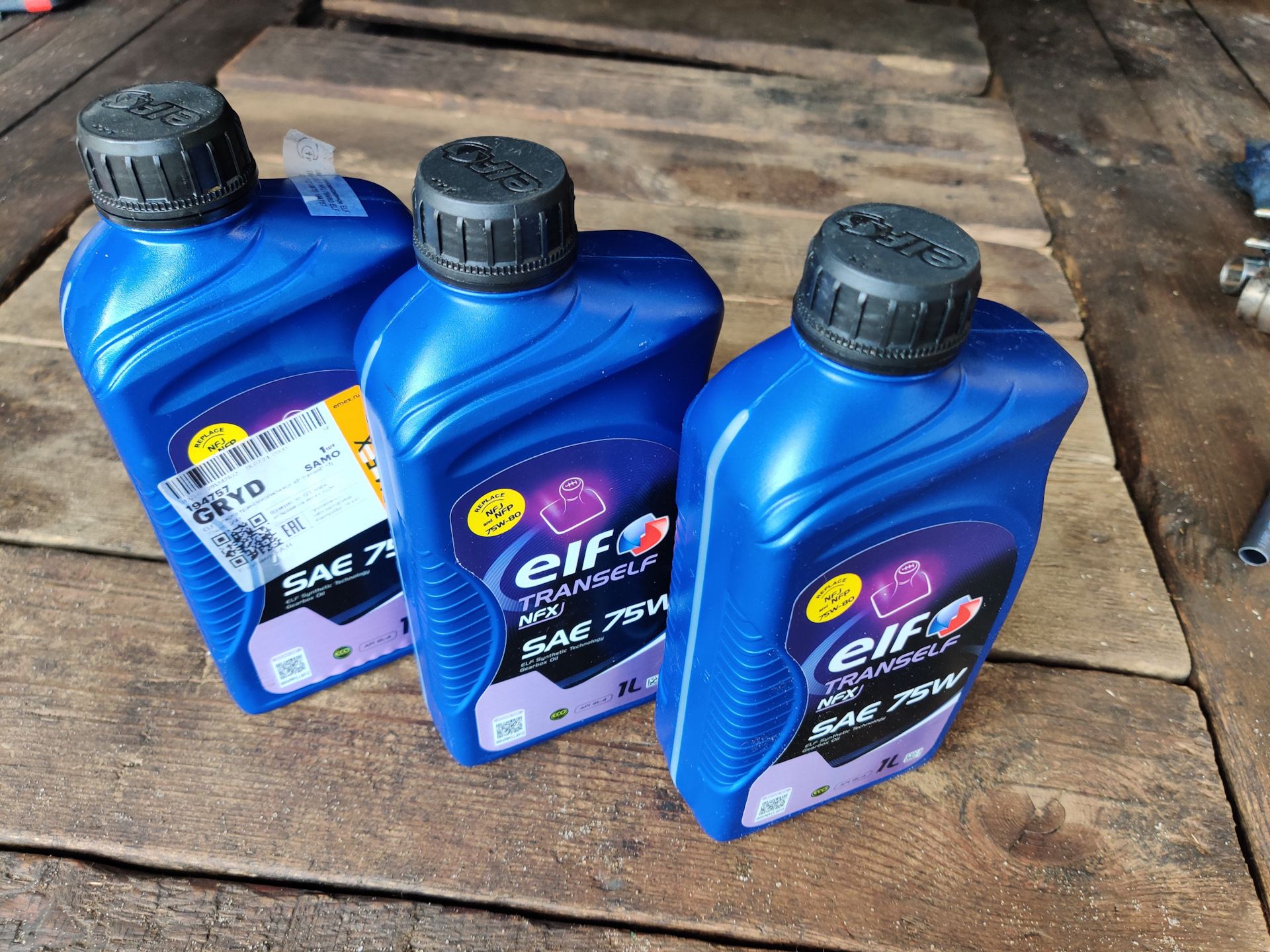 Пока находился под машиной, а находился я под ней достаточно продолжительное время, обнаружил, что уровня масла в коробке просто нет. Причем, коробка абсолютно сухая. Открутив пробку, слилась черная непрозрачная жижа, которую не меняли видимо еще никогда. Заказываем 3 литра масла Elf Tranself NFJ 75w80 gl4+ по 1900 за литр, надеясь, что коробка еще не окончательно сдохла, ездив без масла.