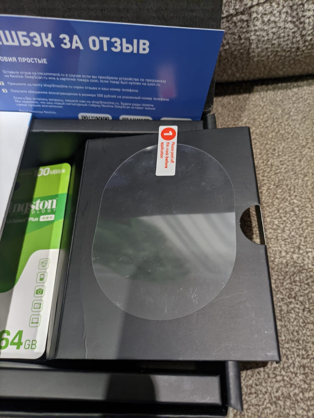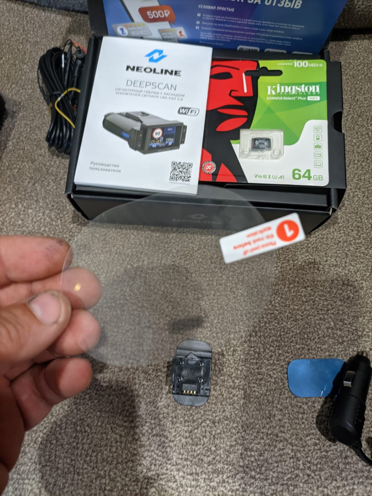 Также в комплекте идет защитная пленка на лобовое стекло для приклейки на него крепления.
