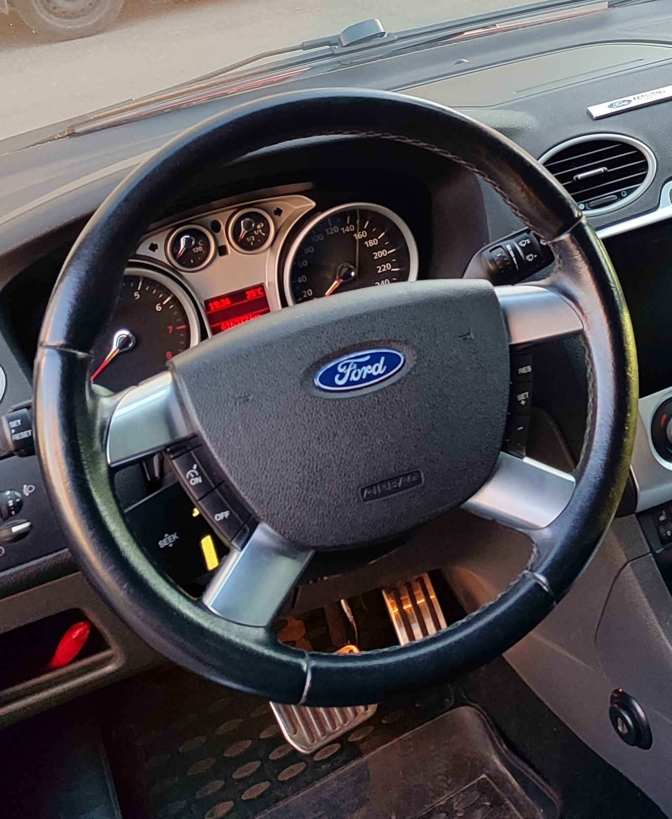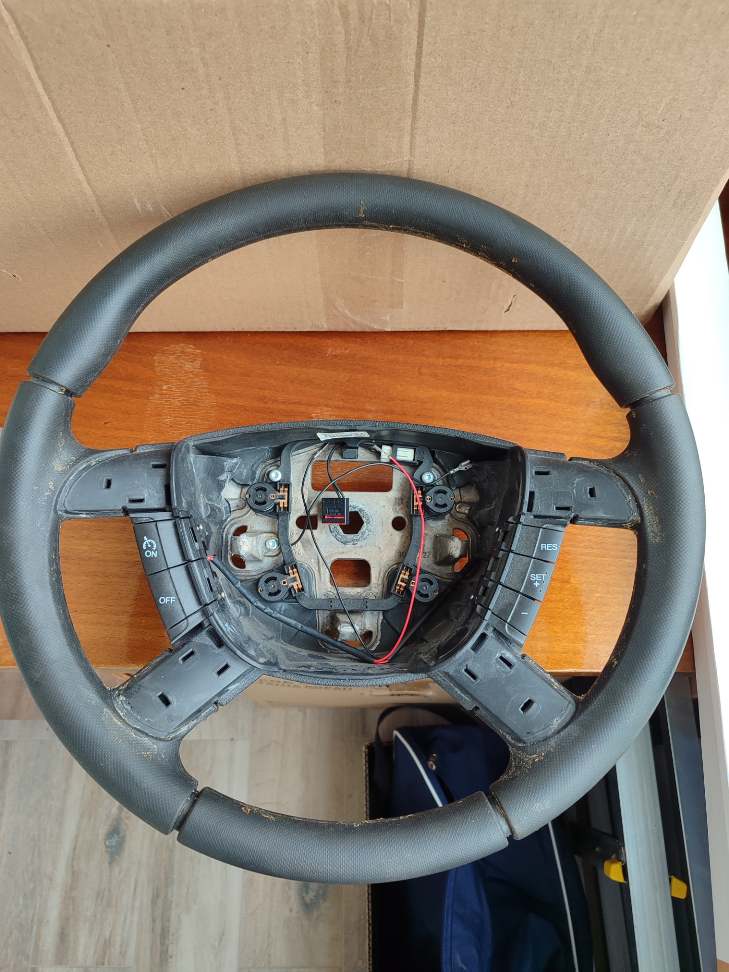 На момент покупки кожа устала, начала крошиться и предхоз надел накладку из кожзама. На разборке я купил б/у руль с круизом в нормальном состоянии (5000₽) и в клубном Fservice мне его установили и активировали круиз(1000₽).