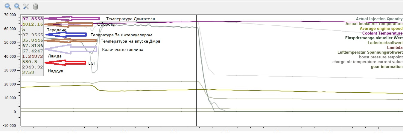 На данной картинке мы видим что при 4000 оборотах на пятой передачи у нас уже 97.8 градусов Ож и 98 градусов температура воздуха при заводских 1.95 бара наддува!, , , , и это с учетом того что температура всасывания воздуха 36 градусов. Далее мы видим количесво впрыскиваемого топлива 67,8 мм3 что соответсвует заводу.