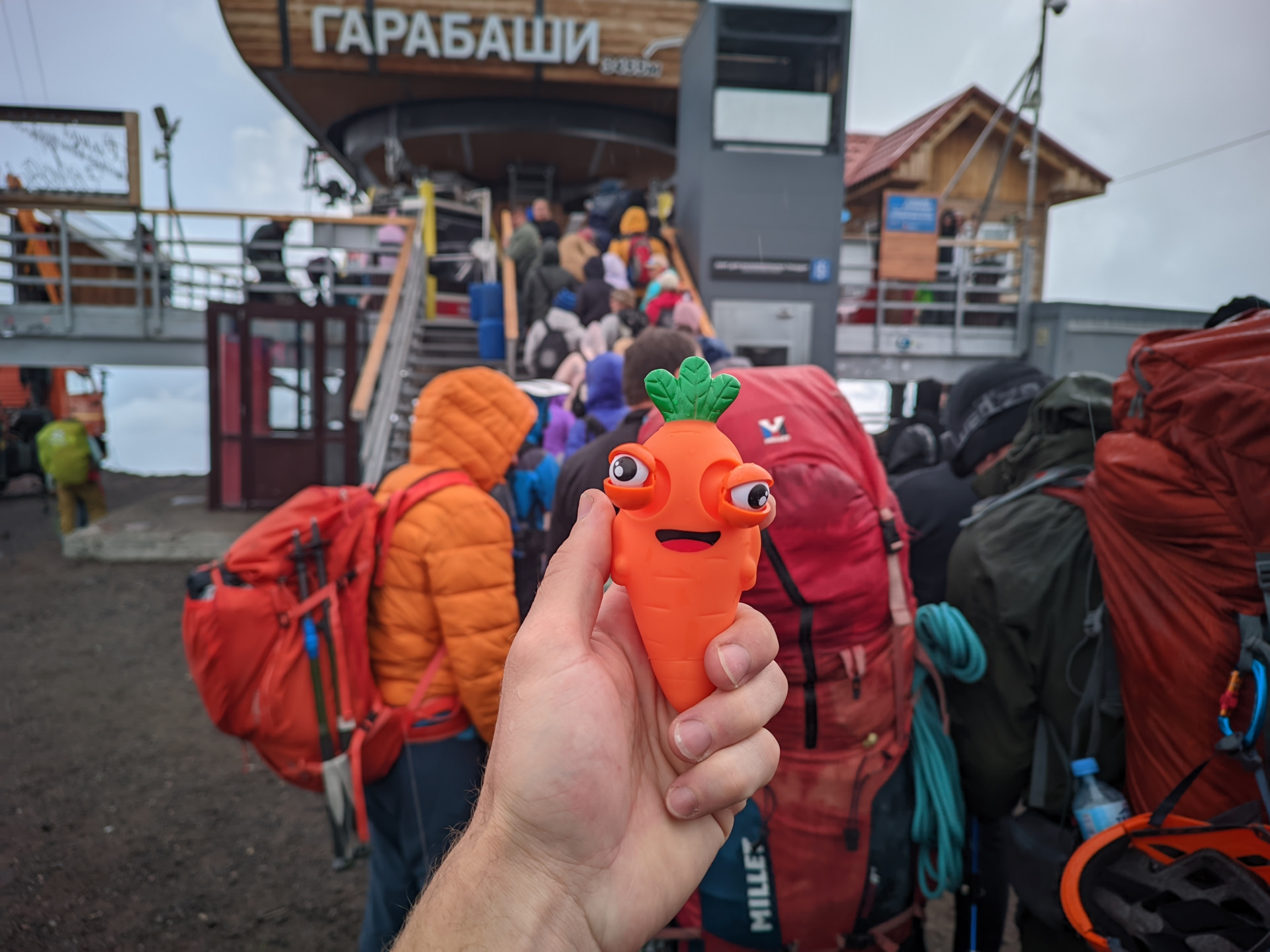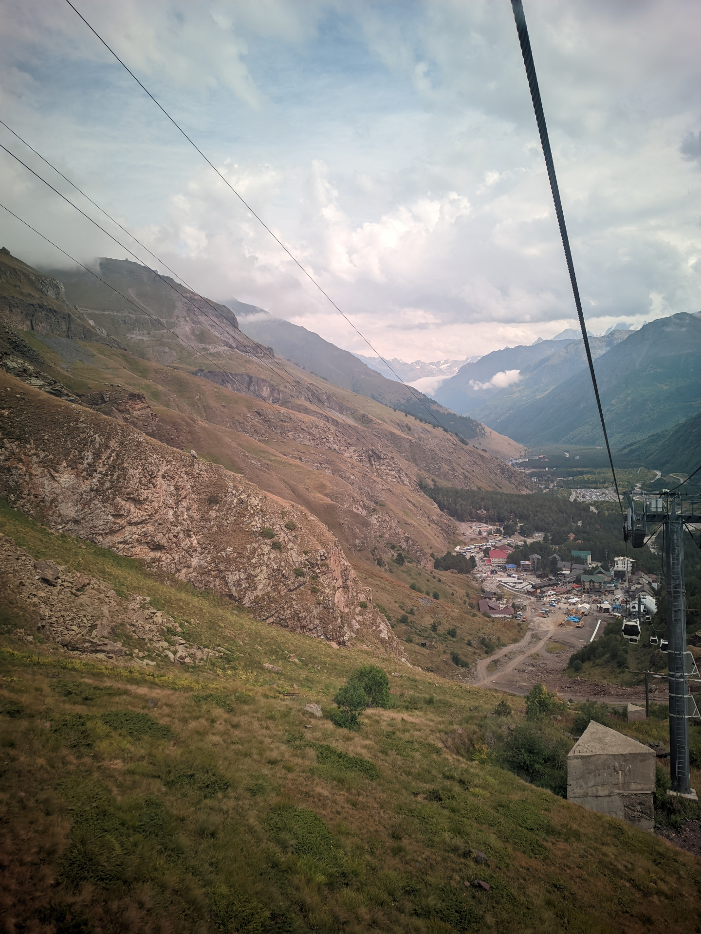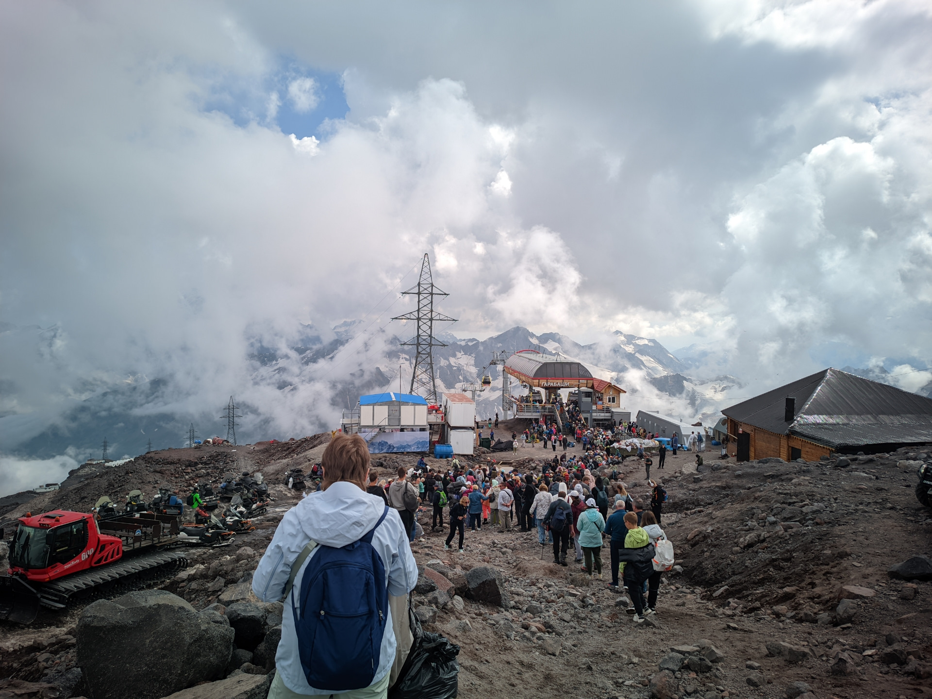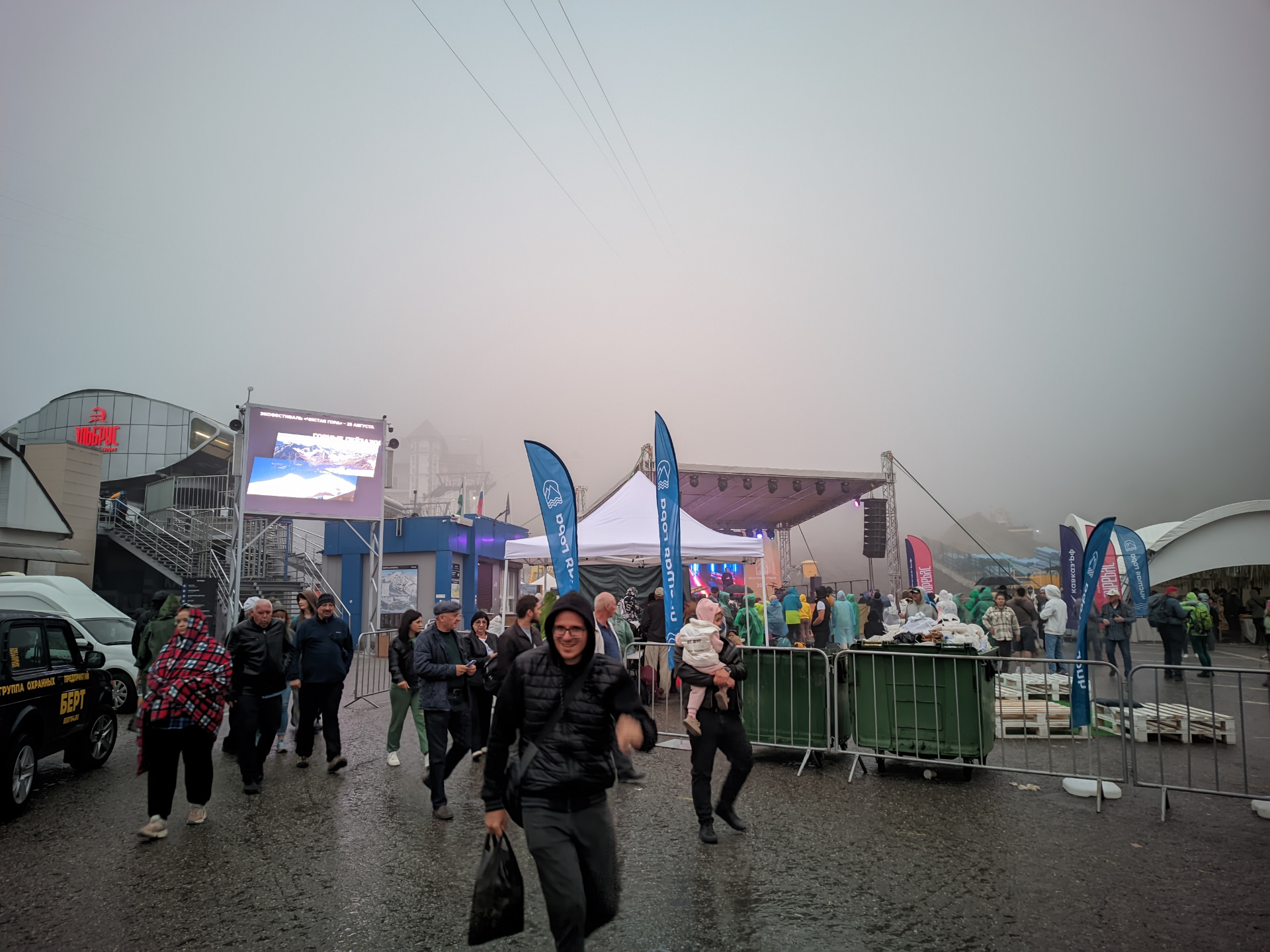 Всё стало заволакивать снова облаками или туманом и пошёл небольшой дождь. Спуски уже были все в облаках, не было видно ничего, еле была видна кабинка обратного направления… Сама длинная очередь была на втором спуске. Но продвигается довольно быстро. Когда мы спустились с небес на землю дождь значительно усилился.